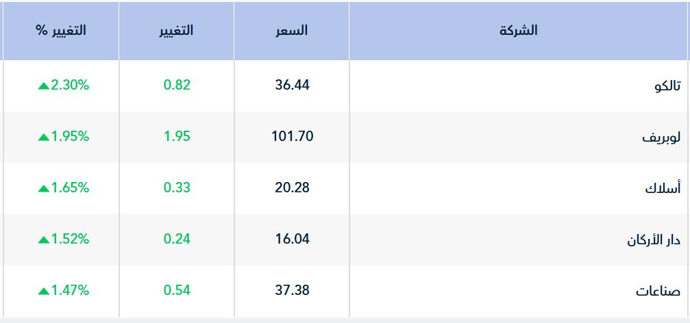 وعلى مستوى الأسهم، شهد 95 سهمًا أداءًا إيجابيًا، بصدارة سهم " تالكو" الذى ارتفع بنسبه 2.30%، تلاه سهم " لوبريف" بارتفاع نسبته 1.95%.
