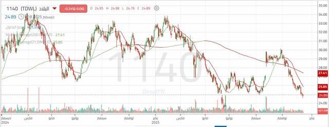 استهل سهم البلاد في عام 2025، بداية ضعيفة نسبياً في أحجام التداول في شهر يناير؛ وبداية من شهر فبراير، بدأ السهم بالتراجع والدخول في حركة تصحيحية واضحة، حيث كوّن قمماً وقيعاناً أدنى حتى شهر يونيو، وسط غياب واضح للقوة الشرائية.