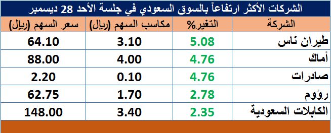 وفي المقابل، تصدر سهم "طيران ناس" الأسهم المرتفعة في "تاسي" بختام جلسة الأحد بنسبة 5.08%، ليصعد سعر السهم إلى 64.10 ريال.