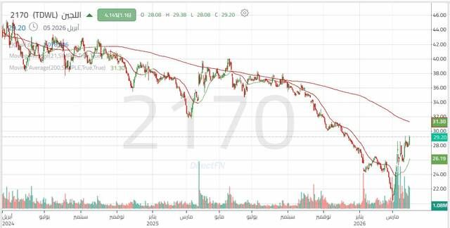 واصل سهم اللجين الاتجاه الهابط خلال عام 2026، مستكملاً الاتجاه الهابط للعام الماضي، مع استمرار الضغوط البيعية خلال شهري يناير وفبراير. ومع ذلك، بدأ السهم في ارتداد تدريجي في محاولة لتكوين قاعدة سعرية للتعافي من الاتجاه الهابط القوي.