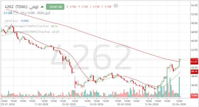 ويتداول السعر حالياً بالقرب من مستويات 41.60ريال، وسيكون أقرب مستهدف للسهم حول منطقة 43.04 – 44.18 ريال، وفي حال استمرار الزخم الشرائي فسيكون المستهدف التالي بالقرب من 45.24 – 45.90 ريال.