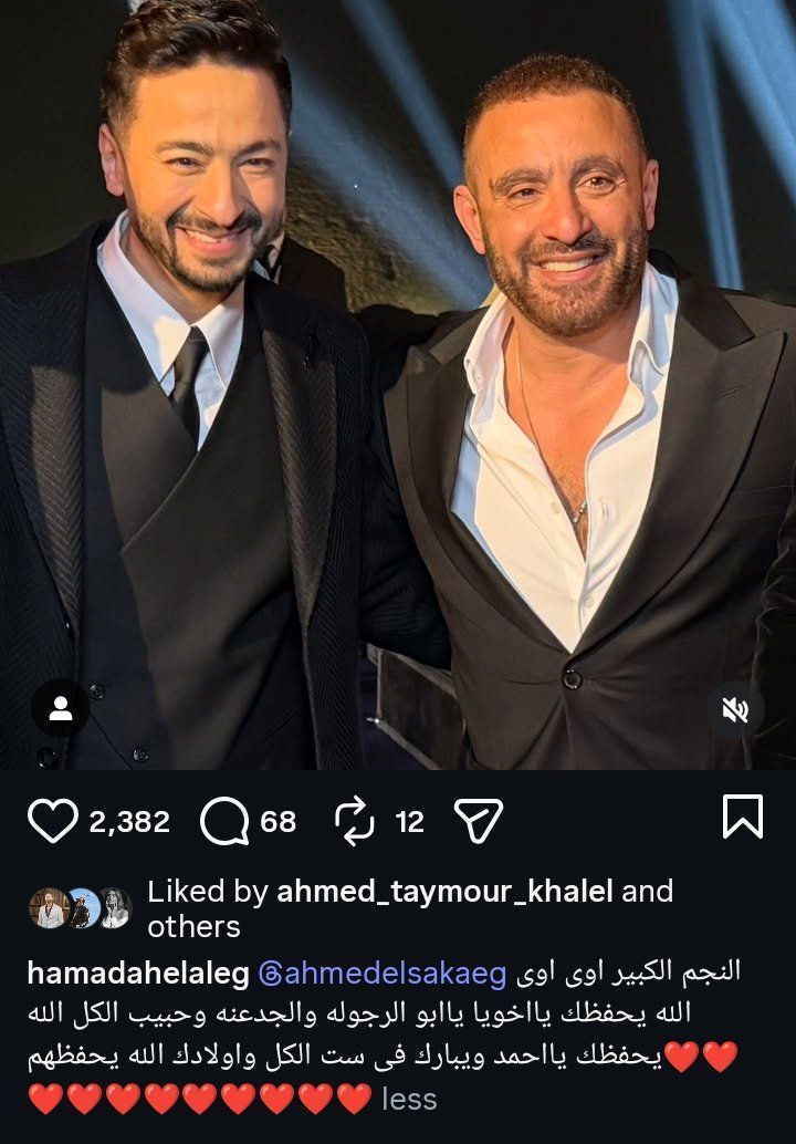 ونشر حمادة هلال صورة له رفقة أحمد السقا على حسابه الرسمي بموقع تبادل الصور والفيديوهات انستجرام، وعلق عليها وفقا لما رصده موقع تحيا مصر: "النجم الكبير اوى اوى الله يحفظك يا اخويا يا ابو الرجوله والجدعنه وحبيب الكل الله يحفظك يا احمد ويبارك فى ست الكل واولادك الله يحفظهم".