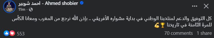تحيا مصر، وكتب شوبير عبر حسابه الرسمي" فيس بوك":" كل التوفيق والدعم لمنتخبنا الوطني في بداية مشواره الأفريقي .. بإذن الله نرجع من المغرب ومعانا الكأس للمرة الثامنة في تاريخنا".