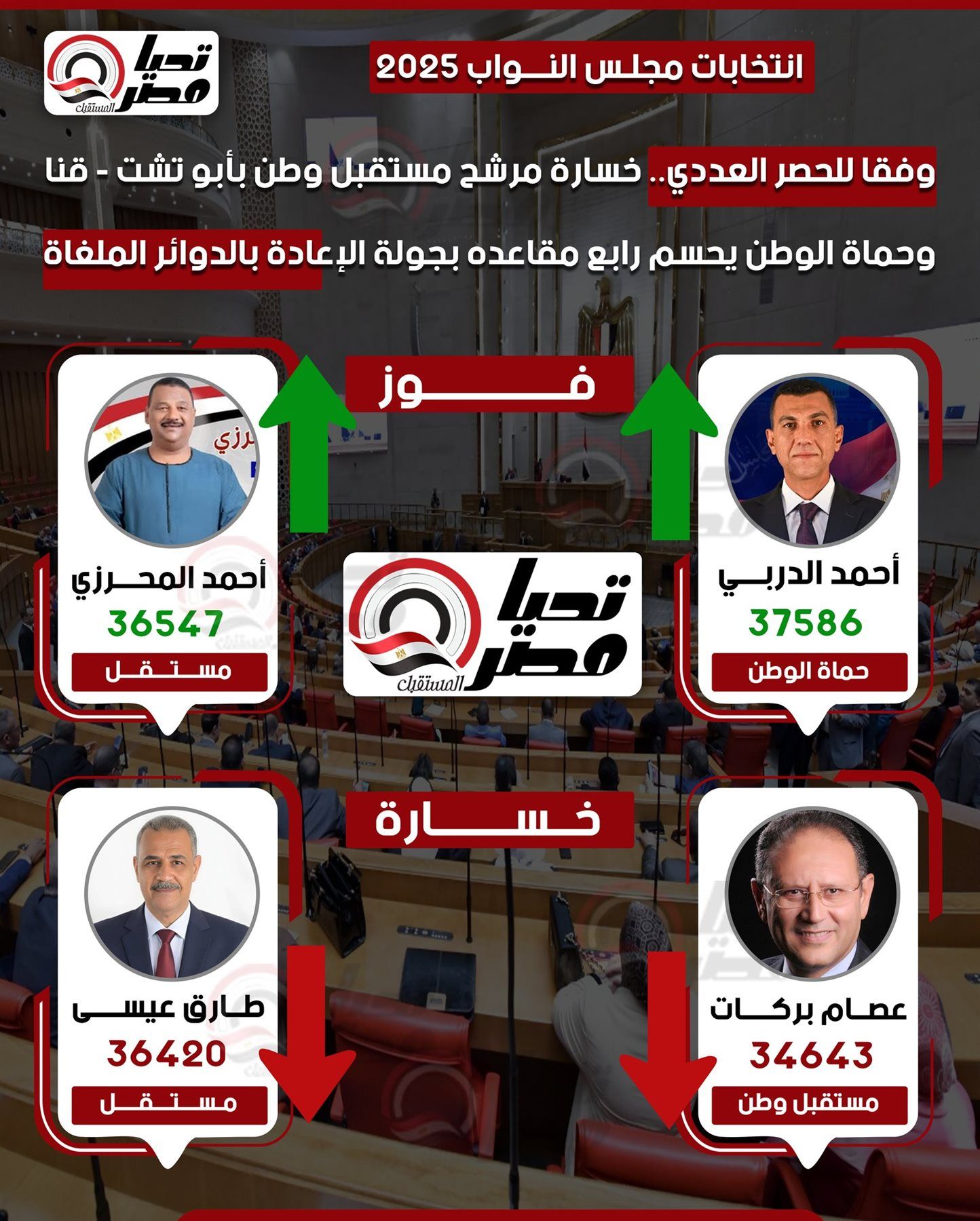 أظهرت مؤشرات الحصر العددي لدائرة أبو تشت بمحافظة قنا ضمن جولة الإعادة للـ 19 دائرة الملغاة بقرار من الهيئة الوطنية للانتخابات ضمن المرحلة الأولى فوز مرشح حزب حماة الوطن أحمد مصطفى الدربي، والمرشح المستقل أحمد عبد الحميد المحرزي بمقعدي الدائرة داخل مجلس النواب في الفصل التشريعي الثالث.