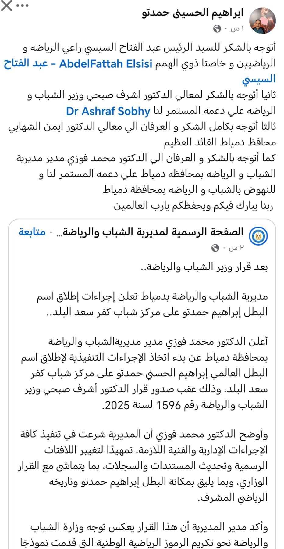 وجاءت رسالة حمدتو عقب اعلان مديرية الشباب والرياضة بدمياط بدء اتخاذ الاجراءات التنفيذية لاطلاق اسم البطل العالمي ابراهيم الحسيني حمدتو على مركز شباب كفر سعد البلد، وذلك بعد صدور قرار وزير الشباب والرياضة الدكتور اشرف صبحي رقم 1596 لسنة 2025.
