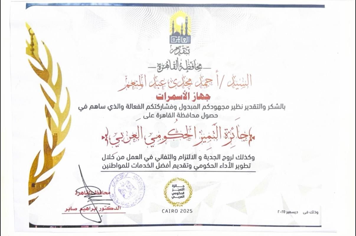 حيث قام محافظ القاهرة، بتكريم العاملين، وتقديم شهادات التقدير لرئيس الجهاز عبدالله شنيشن، وأحمد عبد الحميد، نائب رئيس الجهاز ، وأحمد مجدي مدير المتابعة بجهاز مدينة الأسمرات وكافة العاملين بالجهاز.
