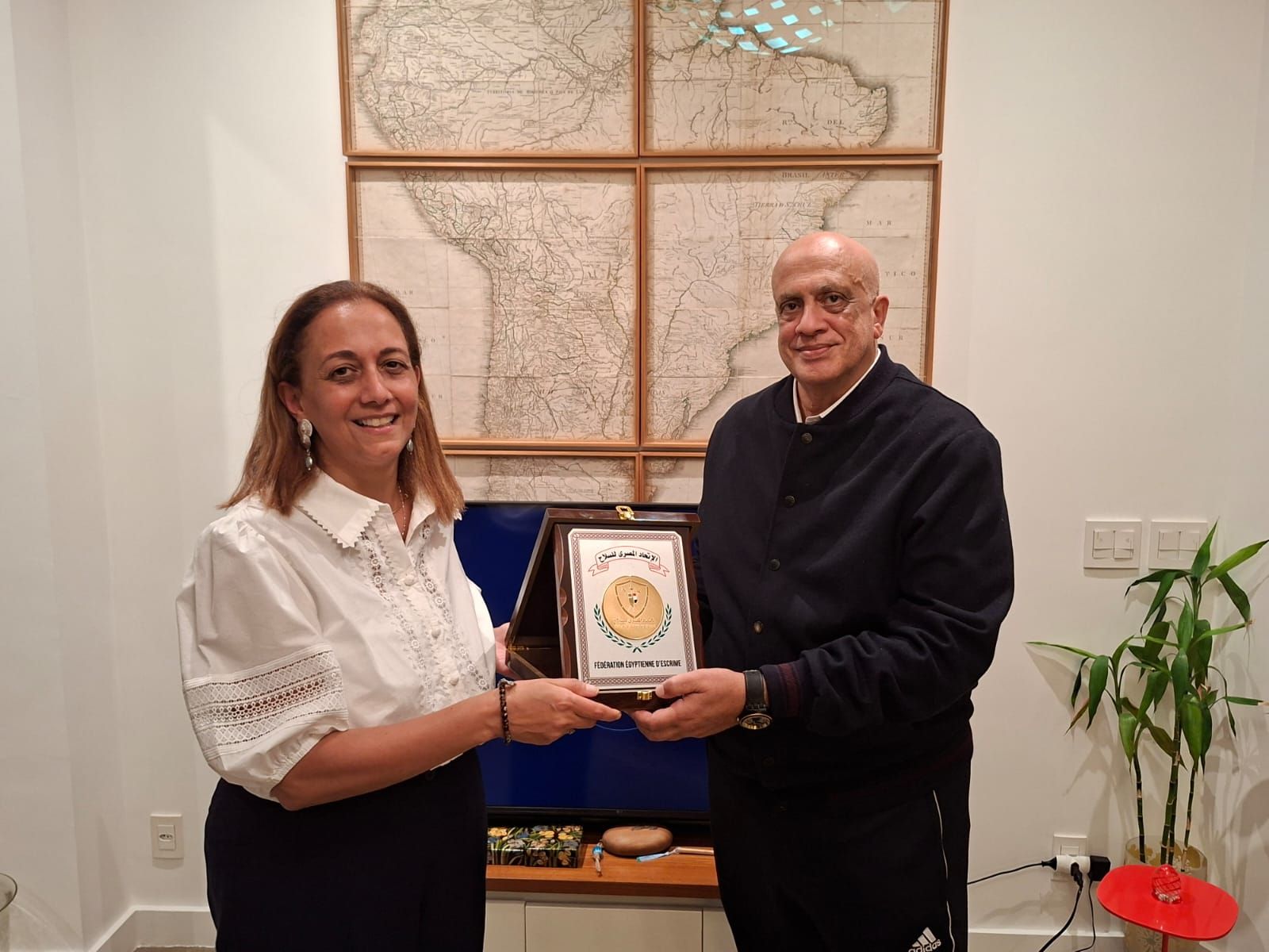 وفي لفتة مميزة تعكس اهتمام البعثات الدبلوماسية المصرية، قامت السفيرة ايمان البنهاوي بتكريم الكابتن طارق الحسيني رئيس بعثة مصر للسلاح ورئيس الاتحاد المصري للسلاح، حيث أهدته درعًا تكريميًا تقديرًا لجهوده الكبيرة في تطوير اللعبة.