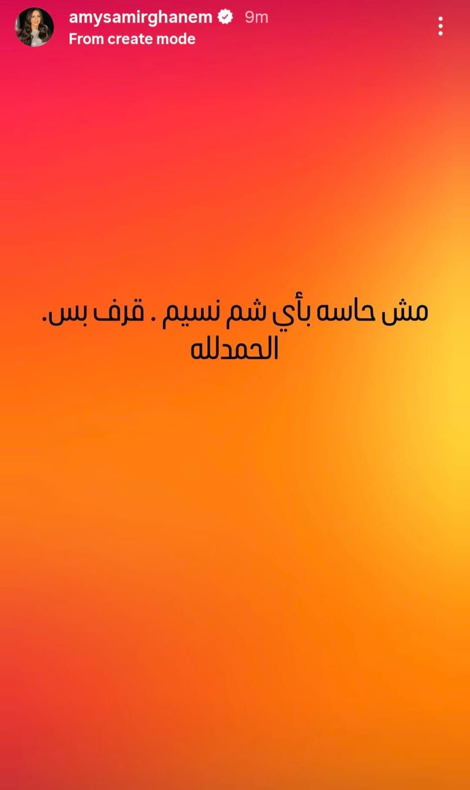 وكتبت إيمي سمير غانم في ستوري رصدها موقع تحيا مصر: مش حاسة بأي شم نسيم.. قرف بس.. الحمدلله.