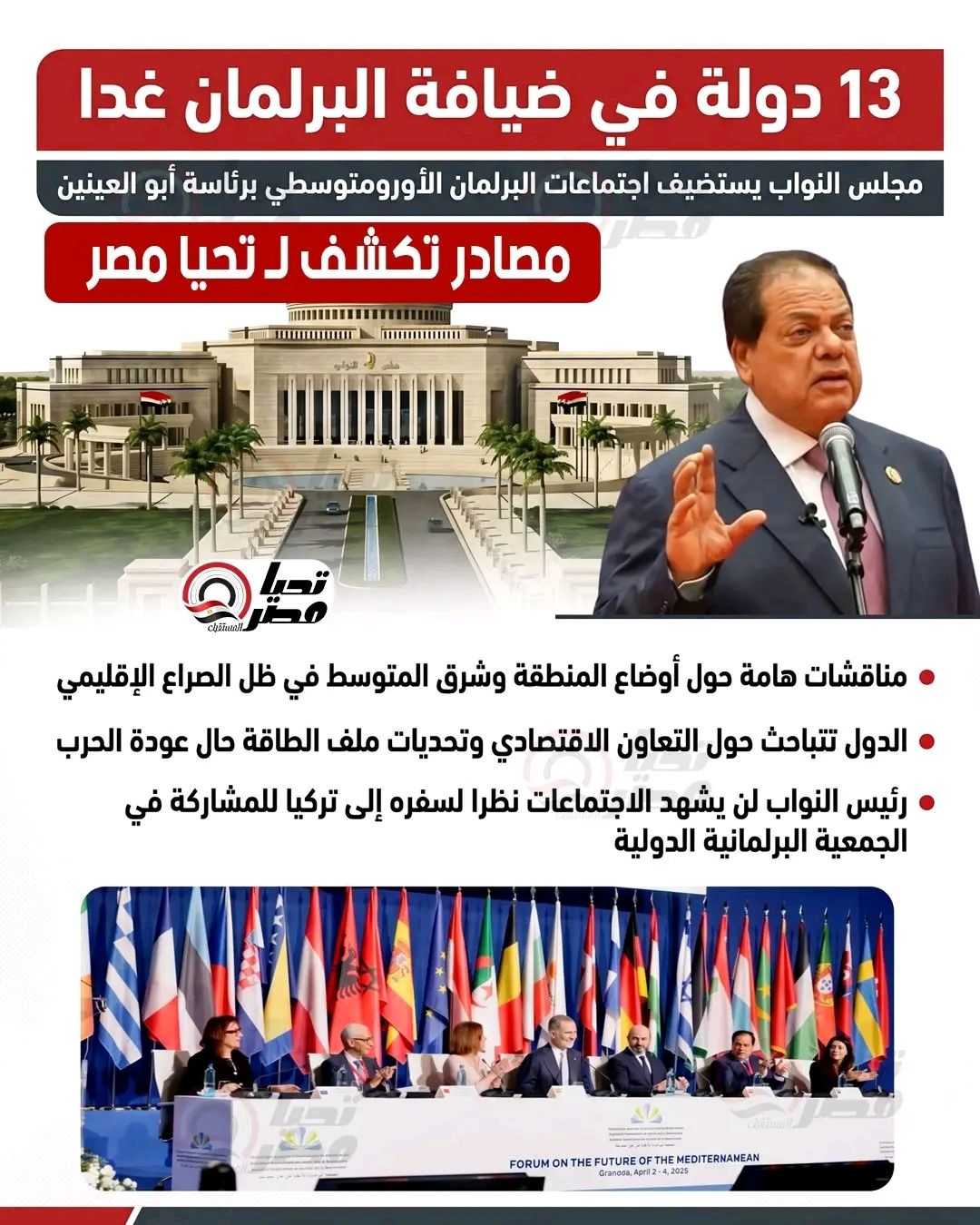 كشفت مصادر برلمانية لـ“تحيا مصر” أن مجلس النواب يستضيف، غدًا، اجتماعات البرلمان الأورومتوسطي، بمشاركة ممثلين عن 13 دولة، وذلك برئاسة النائب محمد أبو العينين، وكيل مجلس النواب.