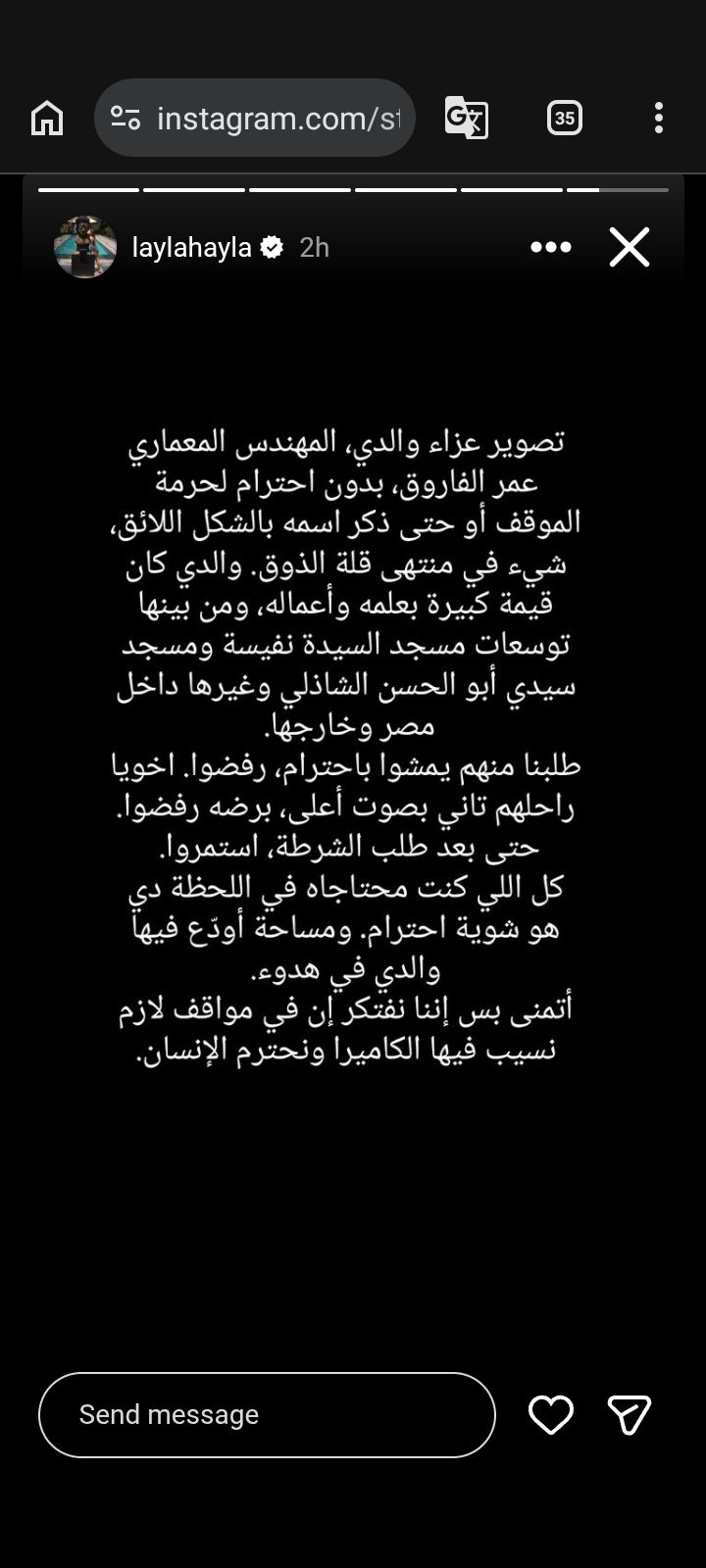 نشرت الفنانة التشكيلية ليلى الفاروق، طليقة الفنان أمير عيد، رسالة غاضبة عبر "ستوري إنستجرام" بعد الجدل الذي صاحب عزاء والدها المهندس المعماري عمر الفاروق، لتكشف عن كواليس ما حدث مع المصورين والصحفيين في سرادق العزاء.