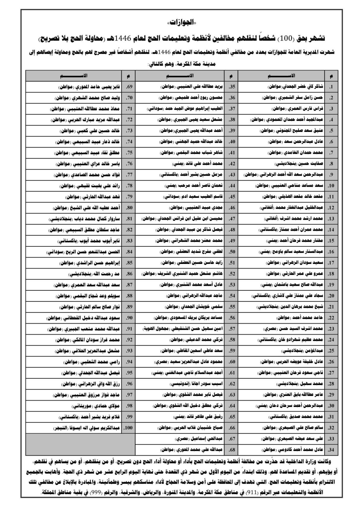 «الجوازات» تشهر بحق (100) شخصًا لنقلهم مخالفين لأنظمة وتعليمات الحج لعام 1446هـ (محاولة الحج بلا تصريح), اليوم الخميس 29 مايو 2025 04:26 مساءً