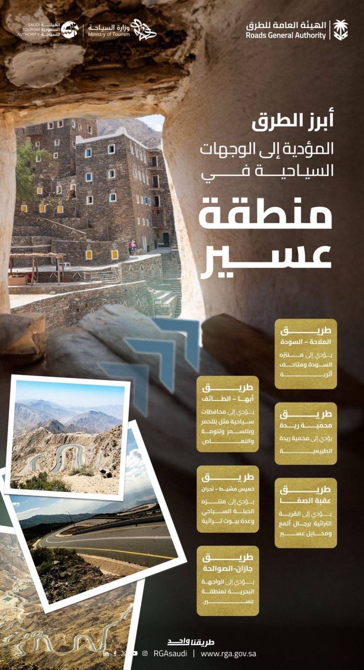في حين شملت الطرق المؤدية إلى المواقع السياحية طريق الملاحة/السودة المؤدي إلى متنزه السودة والمتاحف الأثرية، وطريق محمية ريدة المؤدي إلى محمية ريدة، وطريق عقبة الصماء المؤدي إلى القرية التراثية برجال ألمع ومحايل عسير، وطريق أبها / الطائف المؤدي إلى محافظات سياحية صيفية مثل بللحمر، وبللسمر، وتنومة، والنماص، وطريق الرياض المؤدي إلى البيوت التراثية والمتنزهات، وطريق الساحل جازان/الصوالحة المؤدي إلى الواجهة البحرية لعسير، وطريق خميس مشيط / نجران المؤدي إلى متنزه الحبلة السياحي والبيوت التراثية، وتُشكل هذه الطرق نقطة وصل حيوية تسهل الوصول إلى التنوع الثقافي والطبيعي المتفرد في المنطقة.
