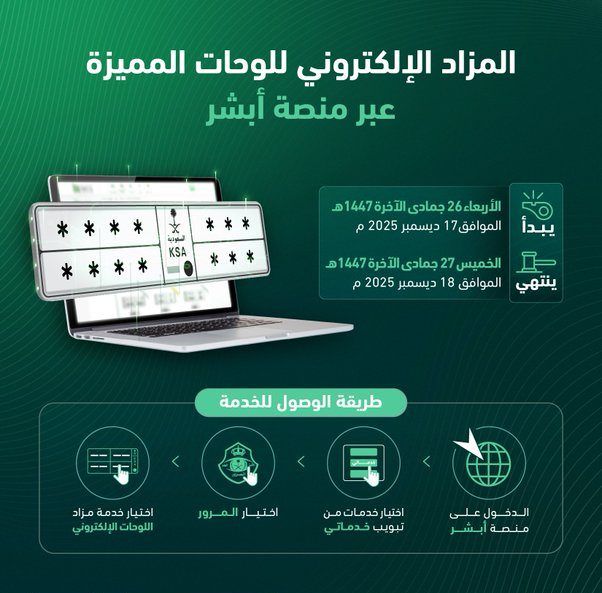 نوهت الإدارة العامة للمرور عن طرح مزاد اللوحات الإلكتروني غدًا الأربعاء الموافق 17 ديسمبر 2025م، وذلك عبر منصة “أبشر”، التي تمكّن الراغبين في شراء اللوحات المميزة من المشاركة في المزاد إلكترونيًا بكل يسر وسهولة.