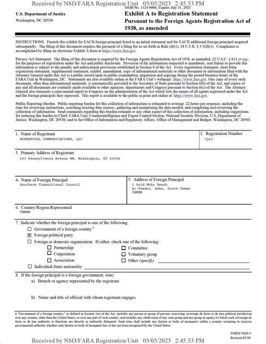 وذكر الموقع الامريكي في تقرير نشره مطلع مايو الجاري أن شركة (Hyperfocal Communications) التي أطلقها العام الماضي المدير الميداني السابق لدونالد ترامب، ستيوارت جولي وعضو اللوبي الديمقراطي يولاندا كاراوي، ستتولى عملية الضغط من أجل الانتقالي الجنوبي لمدة عام، وقدمت أوراقها بداية الشهر لتمثيل الانتقالي.