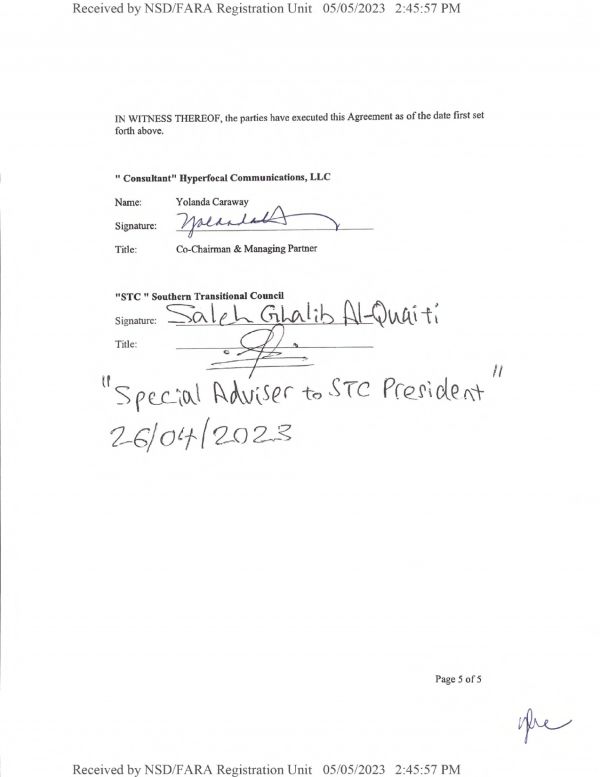 وأظهرت الوثائق المسربة توقيع صالح غالب القعيطي عن "المجلس الانتقالي الجنوبي" عقدا مع المدير الاداري لشركة علاقات عامة امريكية، تيم فيليبس، في واشنطن بتاريخ 26 من أبريل الماضي، لتنفيذ حملة دعاية وعلاقات عامة في وسائل الاعلام ودوائر القرار الامريكي تروج لاعلان انفصال جنوب اليمن بدولة جنوبية فيدرالية.