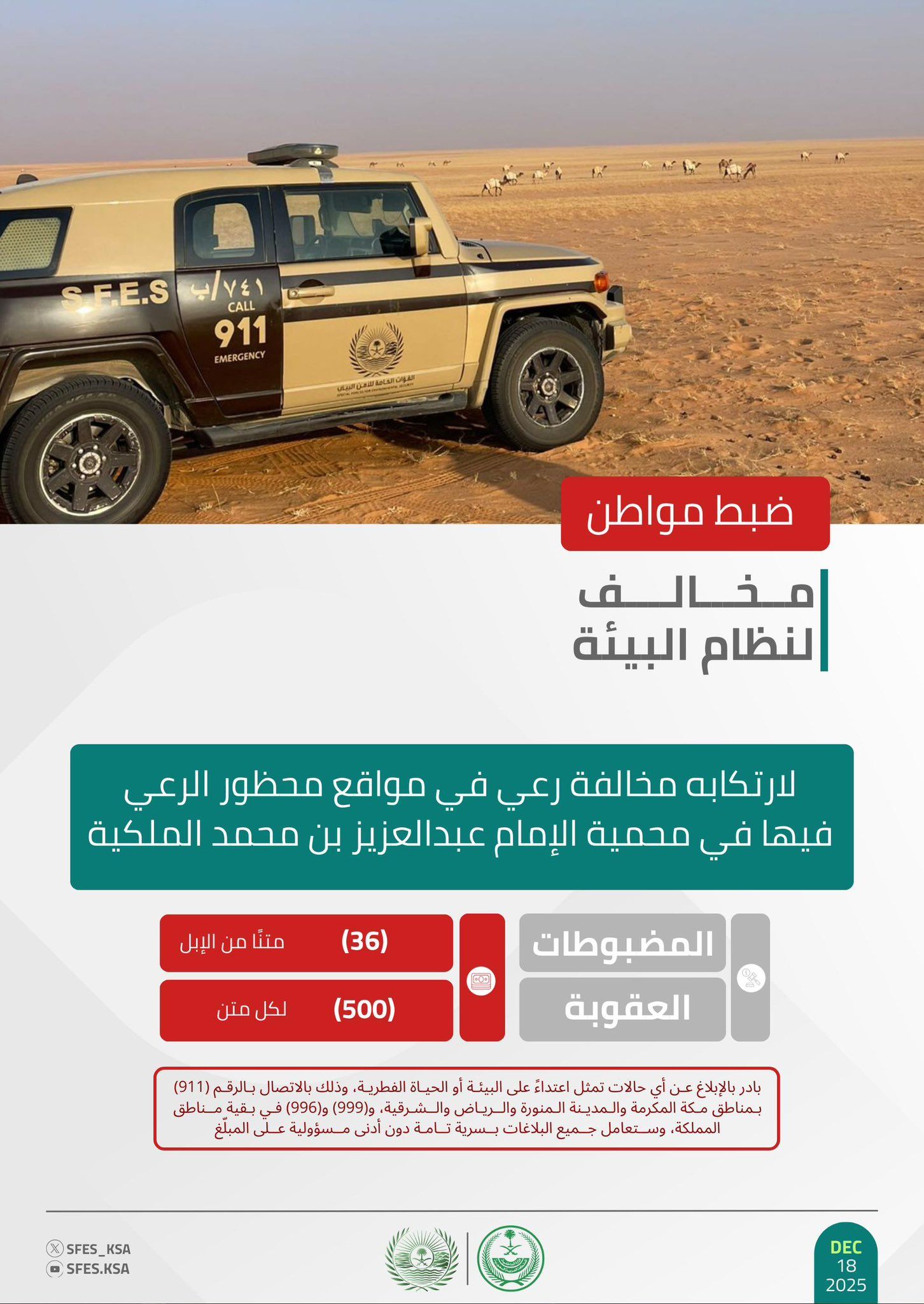 و ضبطت القوات الخاصة للأمن البيئي مواطنًا مخالفًا لنظام البيئة، لارتكابه مخالفة رعي (36) متنًا من الإبل في مواقع محظور الرعي فيها في محمية الإمام عبدالعزيز بن محمد الملكية، وطبقت الإجراءات النظامية بحقه.