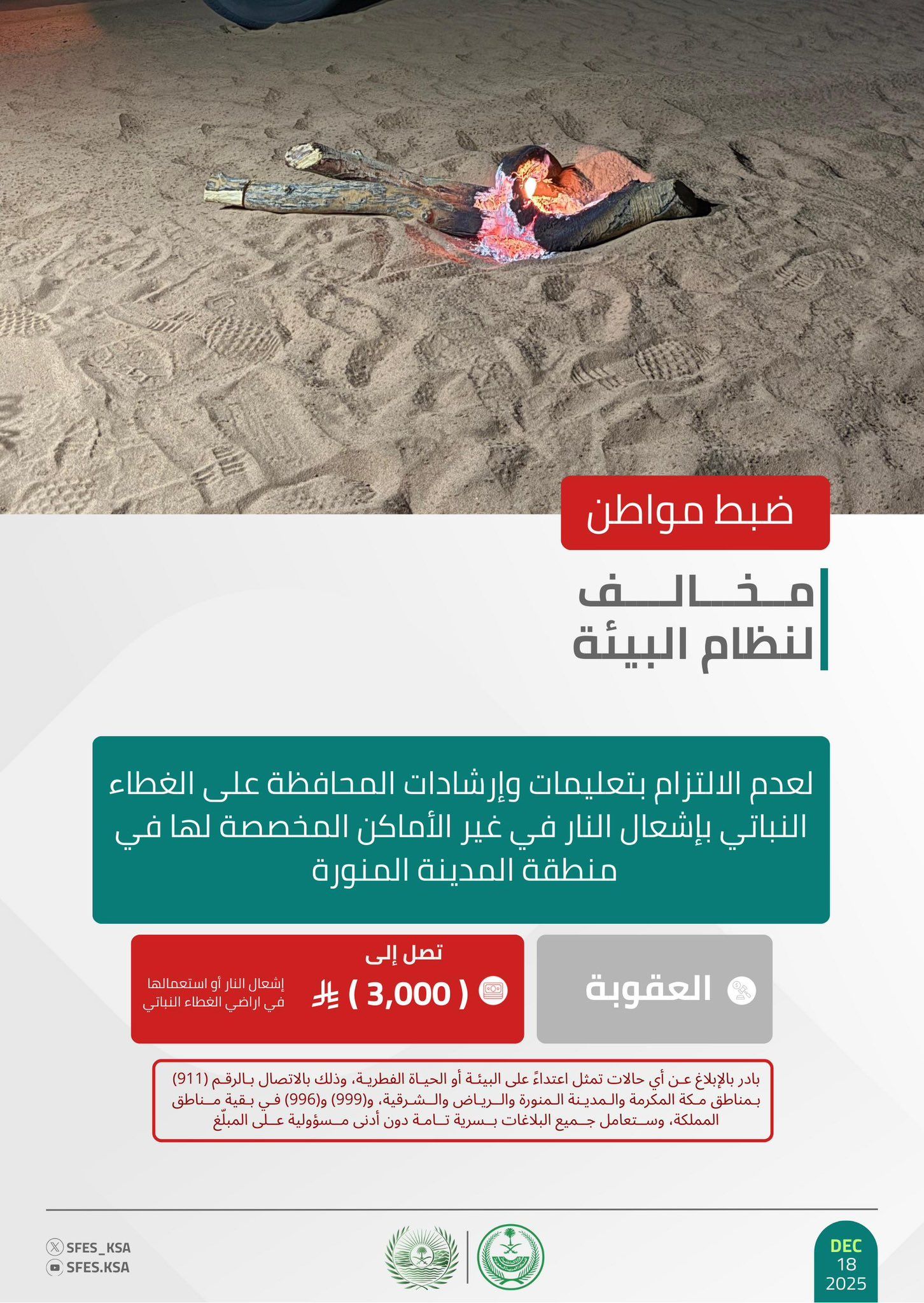 كما ضبطت القوات الخاصة للأمن البيئي مواطنًا مخالفًا لنظام البيئة؛ لعدم الالتزام بتعليمات وإرشادات المحافظة على الغطاء النباتي بإشعال النار في غير الأماكن المخصصة لها في منطقة المدينة المنورة، وطُبقت الإجراءات النظامية بحقه.