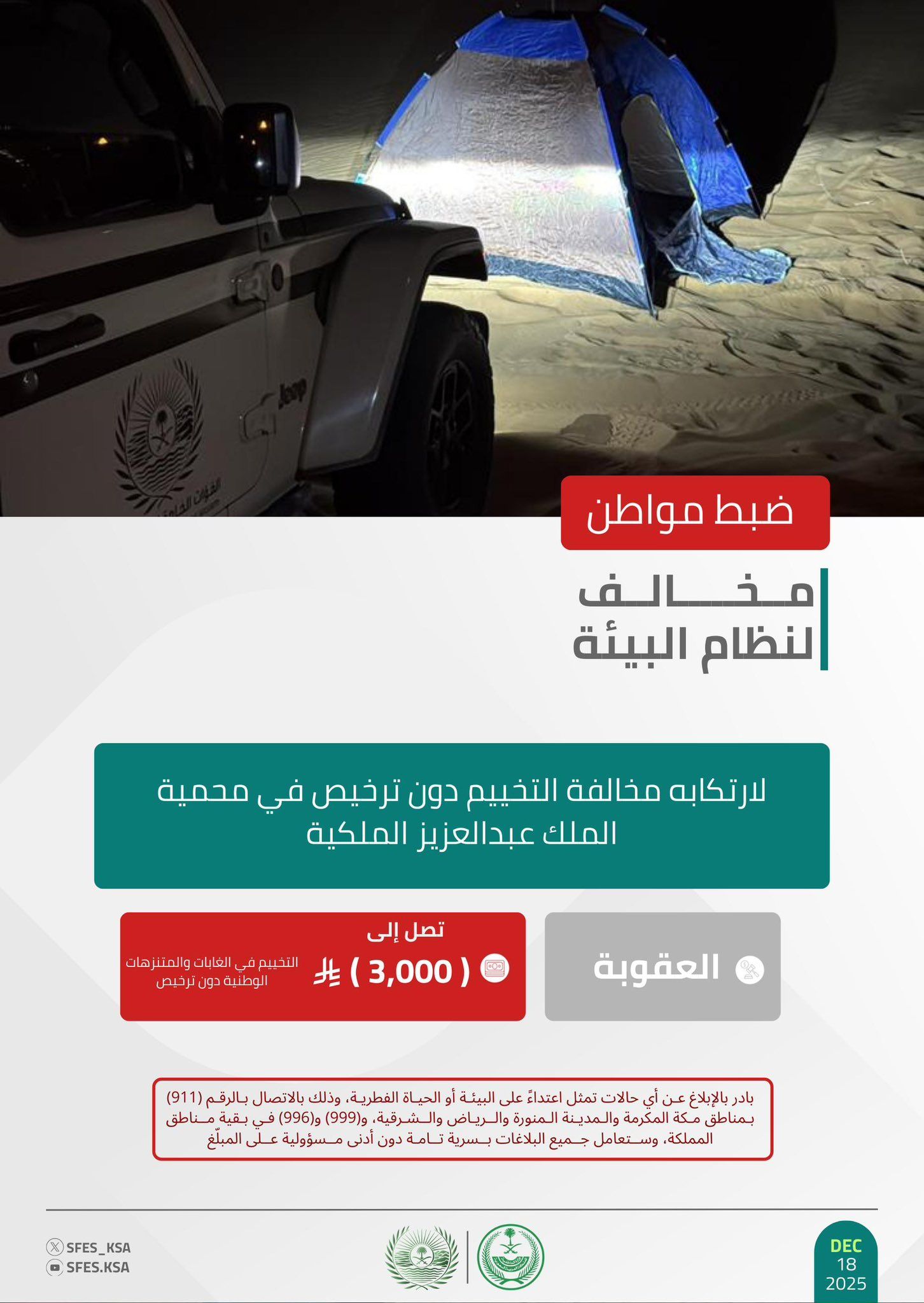 وأوضحت القوات أن عقوبة مخالفة التخييم في الغابات أو المتنزهات الوطنية دون ترخيص غرامة تصل إلى (3,000) ريال، حاثةً على الإبلاغ عن أي حالات تمثل اعتداءً على البيئة أو الحياة الفطرية على الرقم (911) بمناطق مكة المكرمة والمدينة المنورة والرياض والشرقية، و(999) و(996) في بقية مناطق المملكة، وستعامل جميع البلاغات بسرية تامة دون أدنى مسؤولية على المبلّغ.