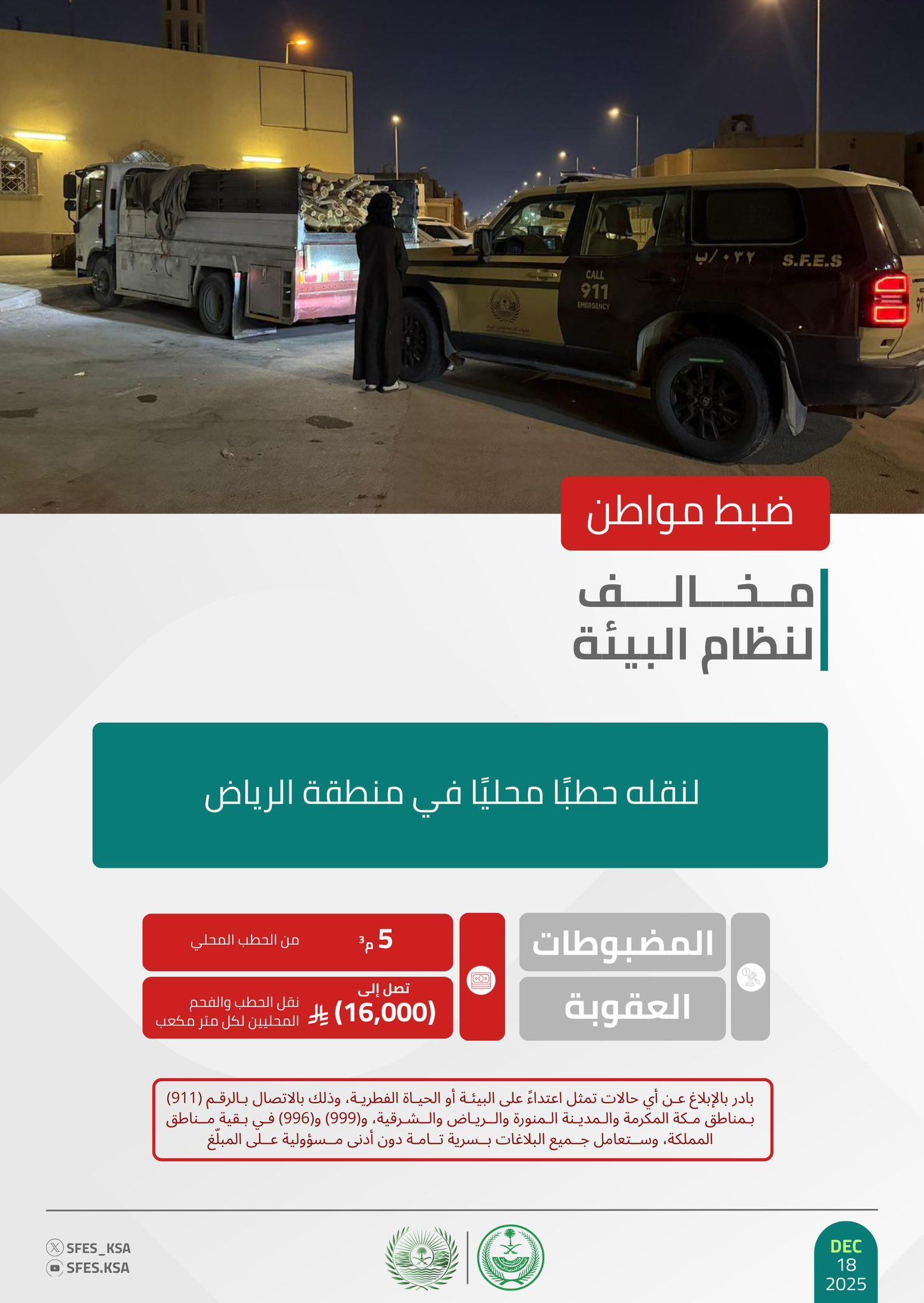 وأوضحت القوات أن عقوبة نقل الحطب والفحم المحليين تصل إلى (16,000) ريال لكل متر مكعب، حاثةً على الإبلاغ عن أي حالات تمثل اعتداءً على البيئة أو الحياة الفطرية على الرقم (911) بمناطق مكة المكرمة والمدينة المنورة والرياض والشرقية، و(999) و(996) في بقية مناطق المملكة، وستعامل جميع البلاغات بسرية تامة دون أدنى مسؤولية على المبلّغ.