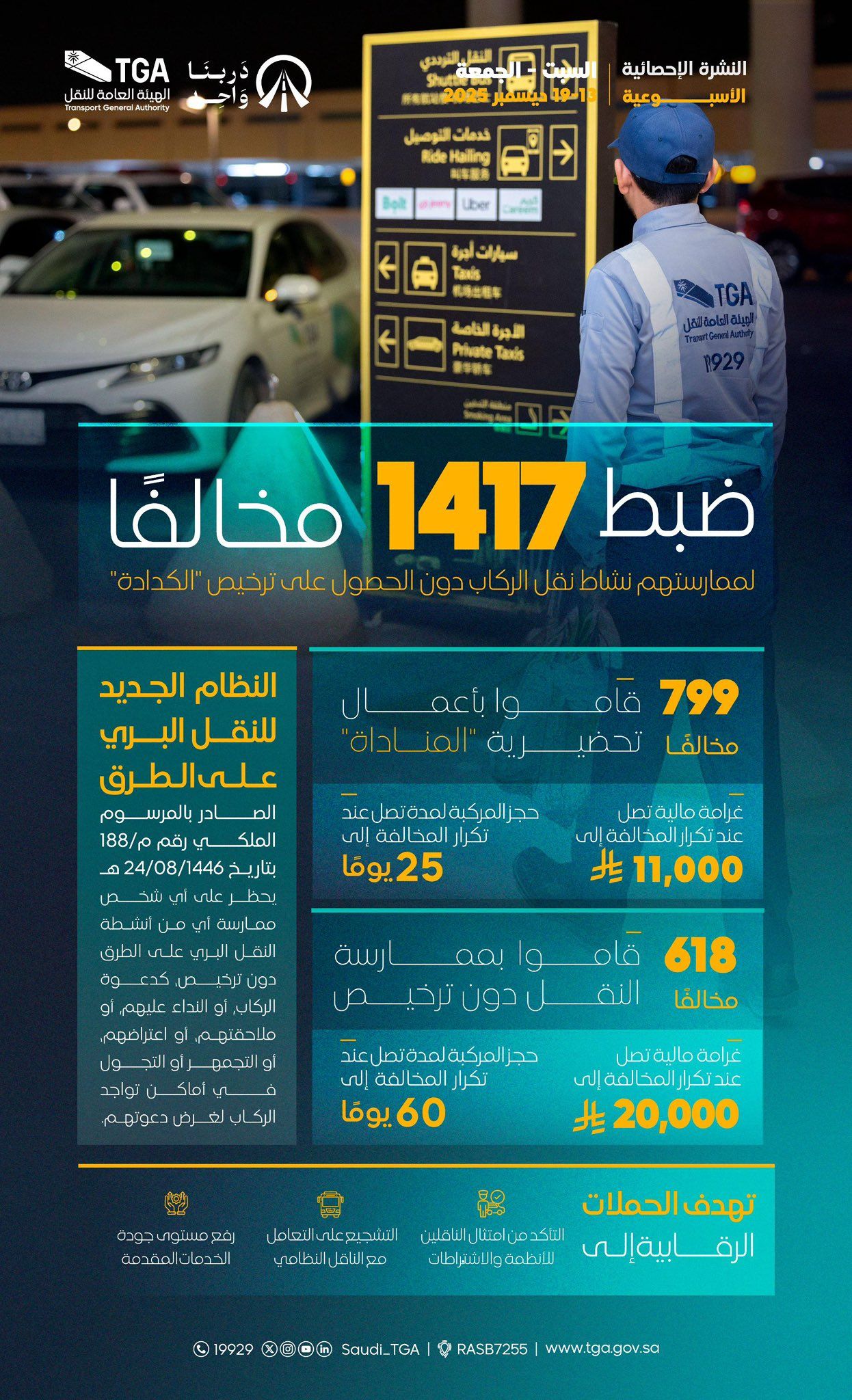 واصلت الفرق الرقابية في الهيئة العامة للنقل جولاتها التفتيشية، إذ ضبطت خلال الفترة من 13 إلى 19 ديسمبر 2025م، (1417) مخالفًا، أوقعت بحقهم الإجراءات النظامية التي تتضمن حجز المركبات وغرامات مالية؛ لممارستهم نشاط نقل الركاب دون الحصول على ترخيص “الكدادة”، وذلك في مختلف مناطق المملكة، بالتعاون مع عدد من الجهات المعنية.