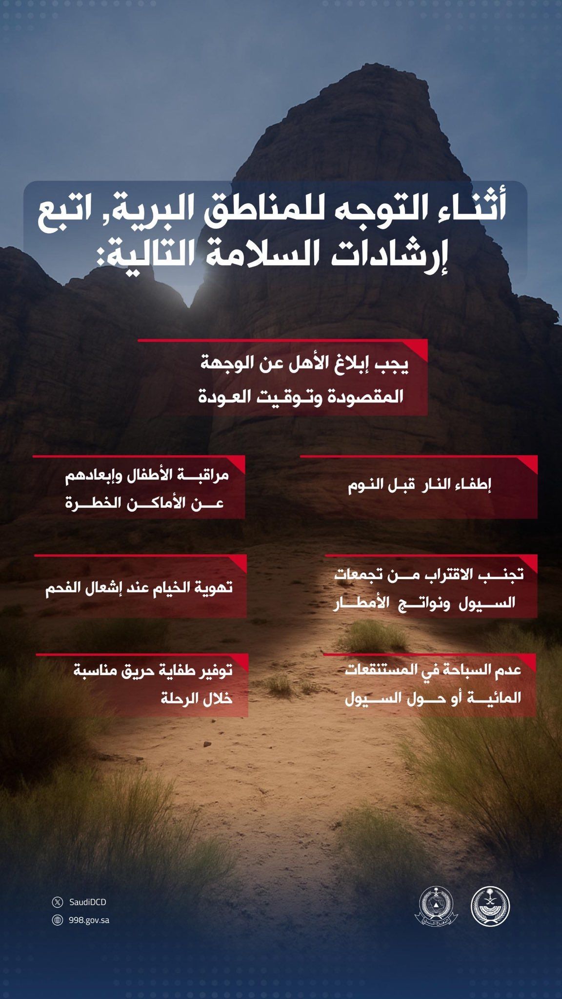 وأوضح الدفاع المدني ضرورة إبلاغ الأهل أو الأقارب بالوجهة المقصودة وتوقيت العودة، مع التأكيد على إطفاء النار بشكل كامل قبل النوم، ومراقبة الأطفال بشكل مستمر وإبعادهم عن المواقع الخطرة.