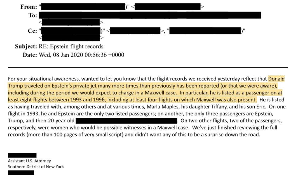 وجاء في الرسالة أن ترامب كان مدرجًا كراكب على متن “ثماني رحلات جوية على الأقل بين عامي 1993 و1996، بما في ذلك أربع رحلات على الأقل كانت (غيسلين) ماكسويل (شريكة إبستين) حاضرة فيها أيضًا”.