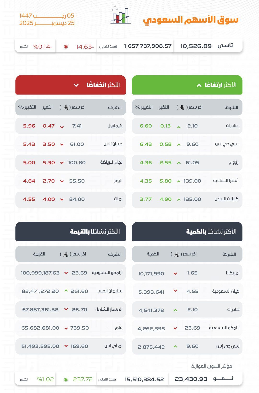 فيما كانت أسهم شركات أمريكانا، وكيان السعودية، والصادرات، وأرامكو السعودية، واتحاد جروننفلدر سعدي القابضة هي الأكثر نشاطًا بالكمية, وكانت أسهم شركات أرامكو السعودية، وسليمان الحبيب، والمسار الشامل، وعلم، والمعمر لأنظمة المعلومات هي الأكثر نشاطًا في القيمة.