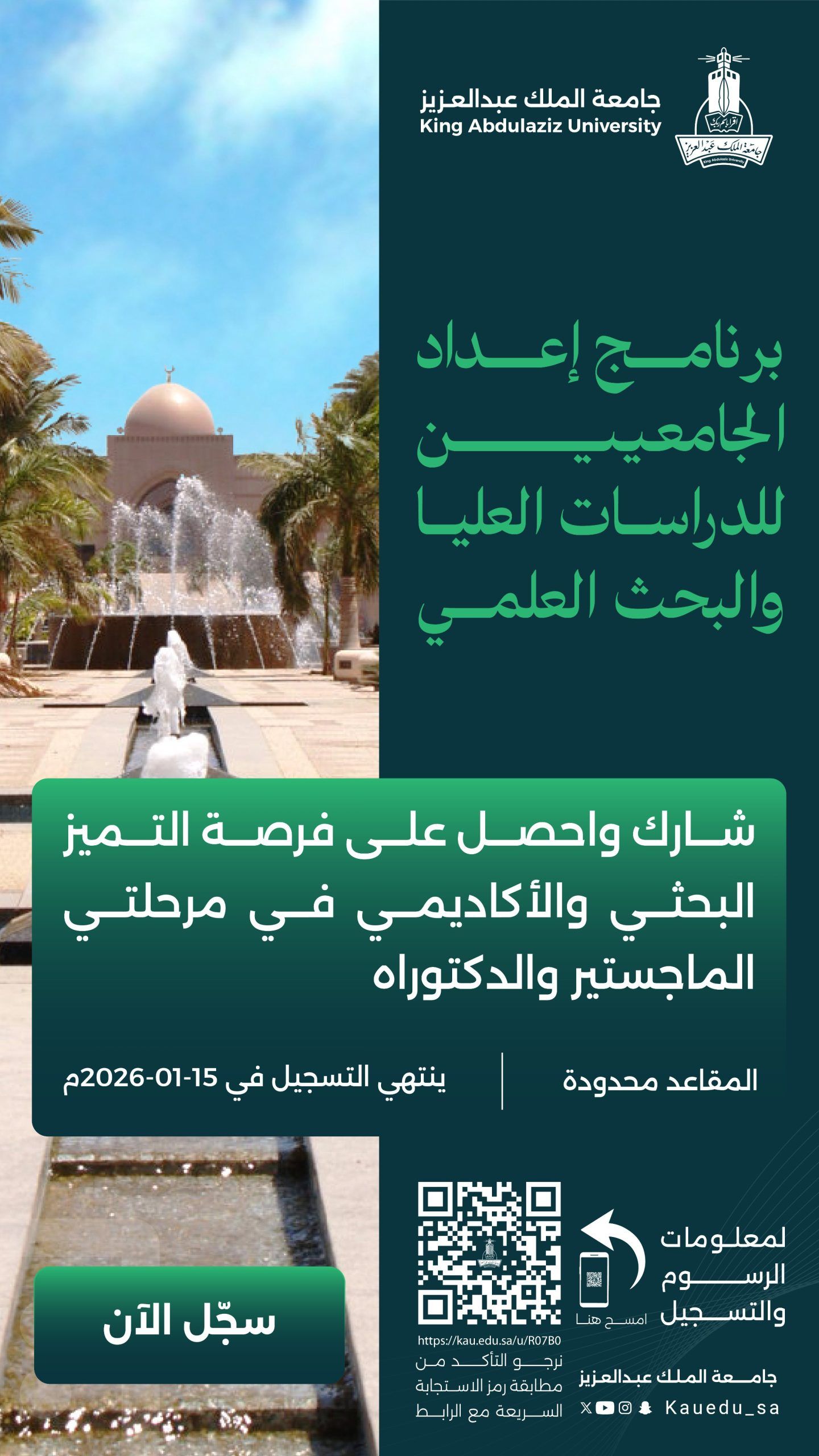 دعت جامعة الملك عبدالعزيز، ممثلة بمركز تطوير التعليم الجامعي، الطامحين للالتحاق ببرامج الدراسات العليا (الماجستير أو الدكتوراه)، والمهتمين بتعلم البحث العلمي في مختلف التخصصات من جميع مناطق المملكة، للتسجيل في برنامج “إعداد الجامعيين للدراسات العليا والبحث العلمي”.