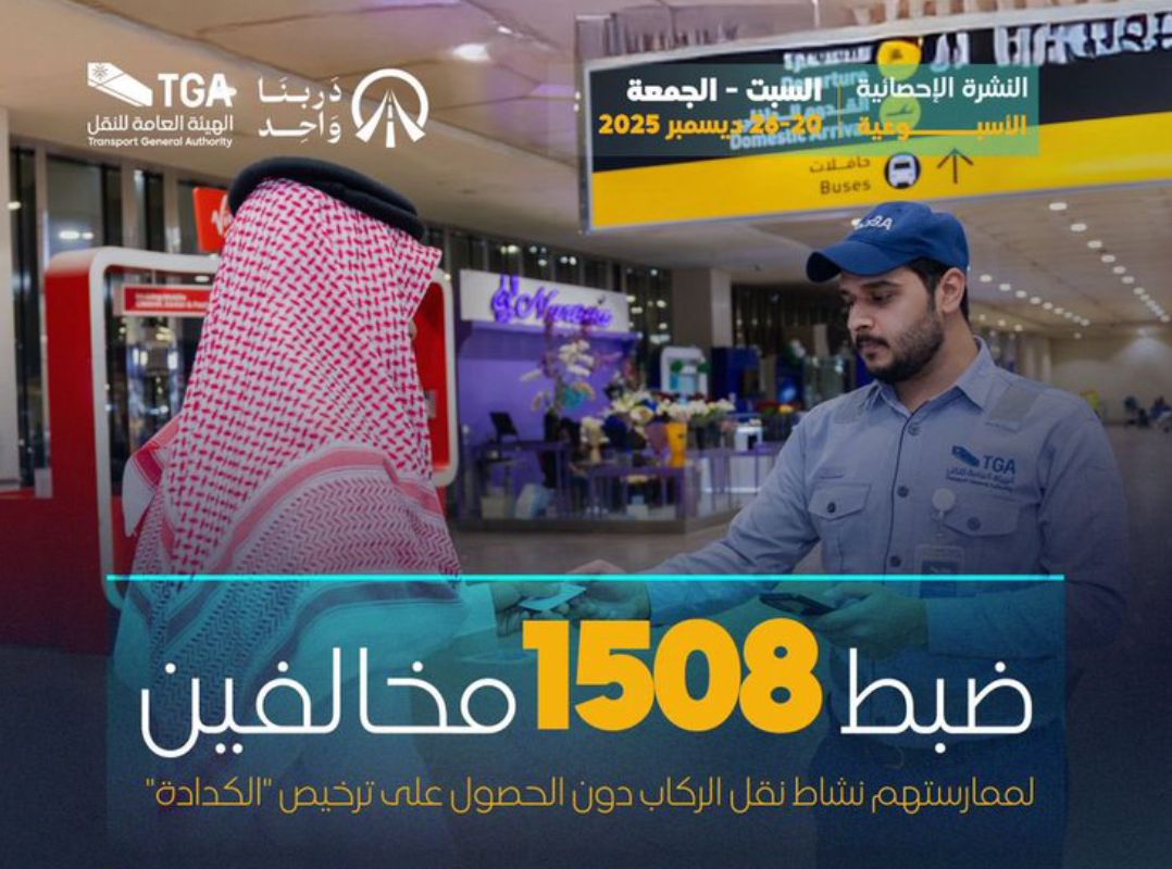واصلت الفرق الرقابية في الهيئة العامة للنقل جولاتها التفتيشية، إذ ضبطت خلال الفترة من السبت إلى الجمعة الموافق 20 ديسمبر الحالي حتى 26 من شهر ذاته، 1508 مخالفين، أوقعت بحقهم الإجراءات النظامية التي تتضمن حجز المركبات وغرامات مالية؛ لممارستهم نشاط نقل الركاب دون الحصول على ترخيص “الكدادة”، وذلك في مختلف مناطق المملكة، بالتعاون مع عدد من الجهات المعنية.