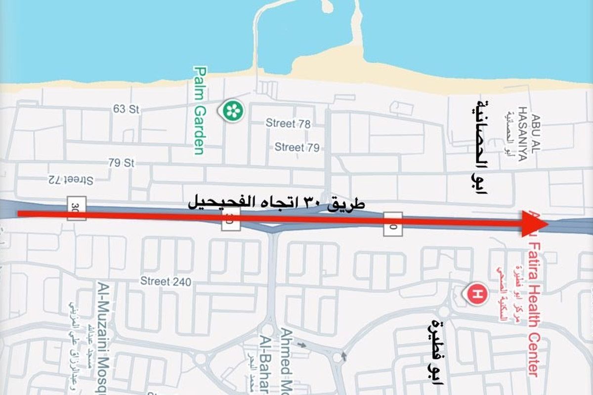 وأوضحت «المرور» أنه سيتم في المقابل افتتاح حارة الأمان والحارة اليمنى، إلى جانب فتح مدخل ومخرج منطقة أبو فطيرة باتجاه الفحيحيل، اعتباراً من اليوم 28 ديسمبر الجاري وحتى 11 يناير المقبل.