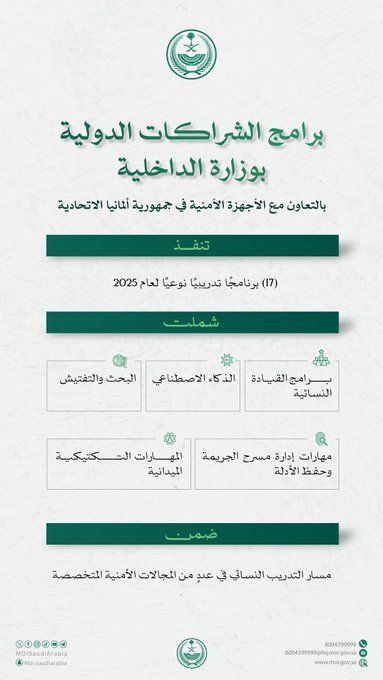 نفّذت برامج الشراكات الدولية بوزارة الداخلية، ضمن خطتها السنوية، وبالتعاون مع الأجهزة الأمنية في جمهورية ألمانيا الاتحادية، (17) برنامجًا تدريبيًا نوعيًا خلال عام 2025م، وذلك ضمن مسار التدريب النسائي لقطاعات وزارة الداخلية، في إطار جهودها المستمرة لتطوير القدرات البشرية.