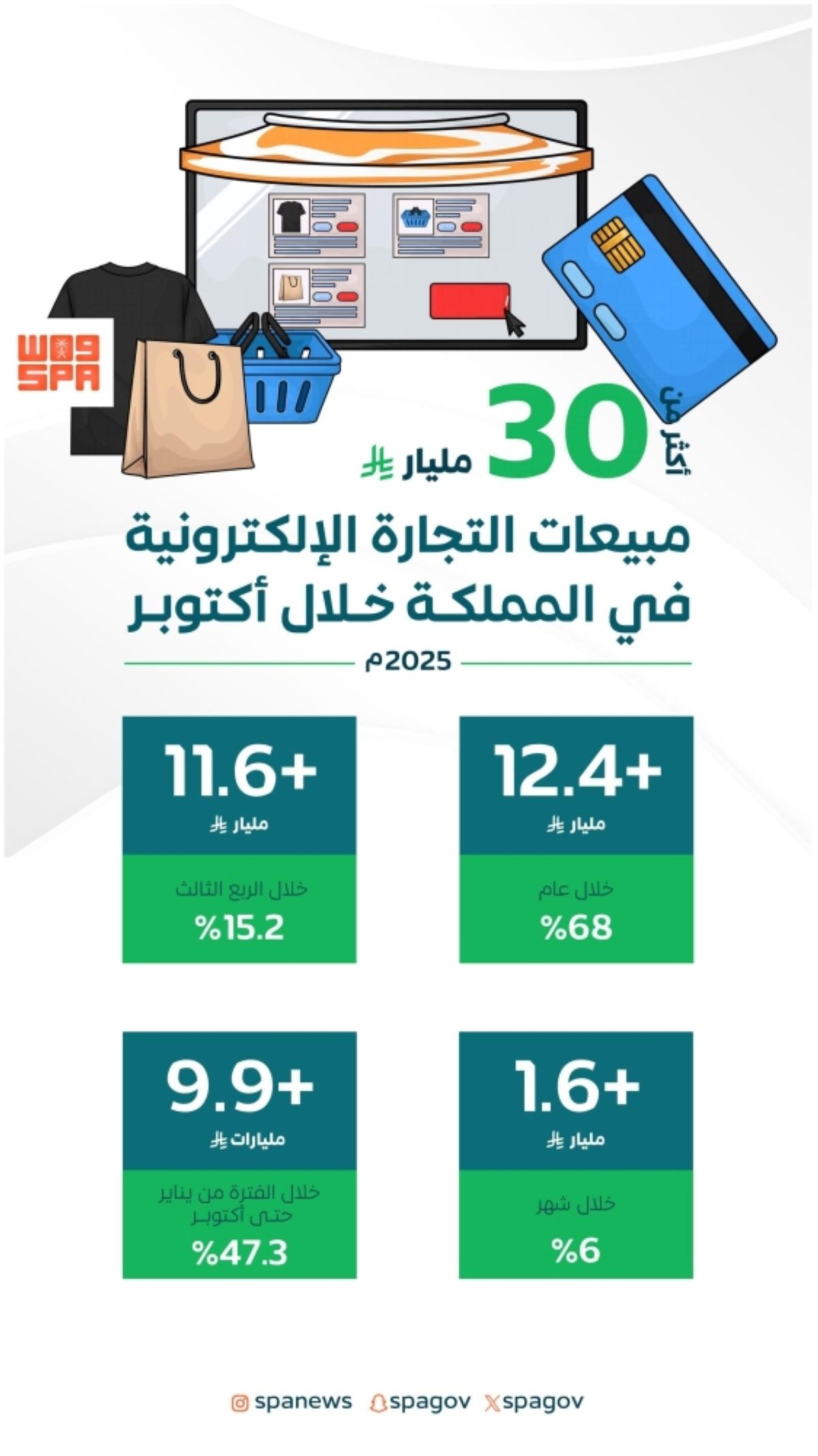 +30 مليار ريال مبيعات التجارة الالكترونية بالمملكة في أكتوبر, اليوم الأحد 28 ديسمبر 2025 11:19 مساءً