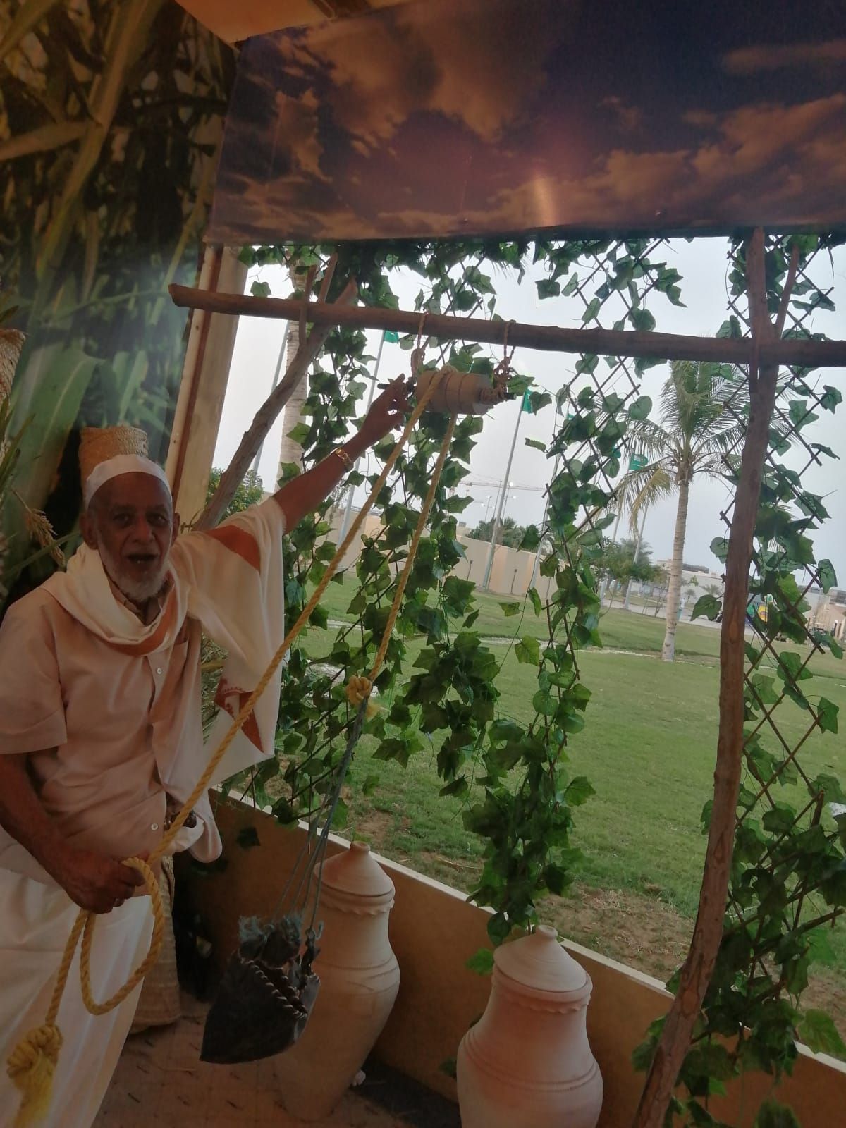 لبس الماضي وهي تقوم بطحين الحب في صورة تراثية وهي تقوم بذلك وفق تراث الماضي وماكان يعتمدعليه الاهالي وبشكل كبير ويعتبراساس كل بيت وكذلك حبال القعايد