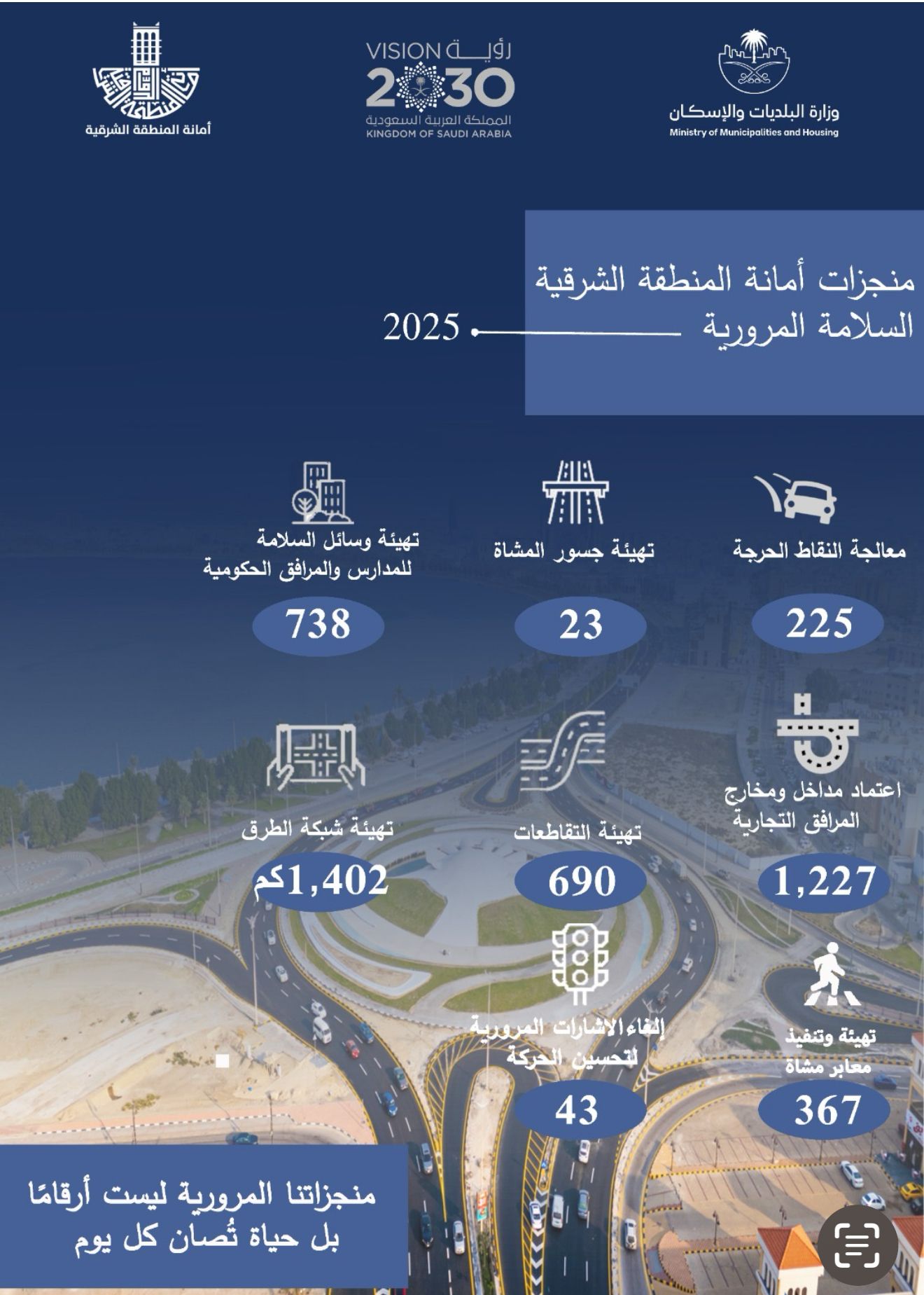 ونوه إلى أن هذه المنجزات تأتي ضمن رؤية شاملة لتطوير منظومة السلامة المرورية، مشددا على أن ما تحقق خلال عام 2025 يعكس التزام أمانة المنطقة الشرقية المستمر لحماية الأرواح وتعزيز جودة الحياة.)