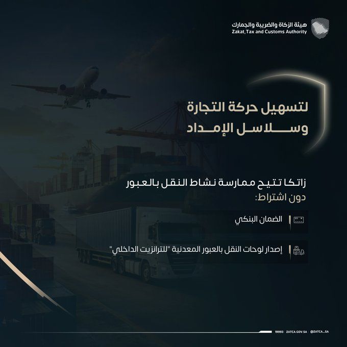 أعلنت هيئة الزكاة والضريبة والجمارك إتاحة ممارسة نشاط النقل بنظام العبور (الترانزيت الداخلي) دون اشتراط تقديم ضمان بنكي، ودون الحاجة إلى إصدار لوحات النقل بالعبور، وذلك ضمن جهودها لتعزيز مرونة إجراءات العمل في منظومة التخليص الجمركي، ورفع كفاءة سلاسل الإمداد عبر المنافذ البرية والبحرية والجوية في المملكة.