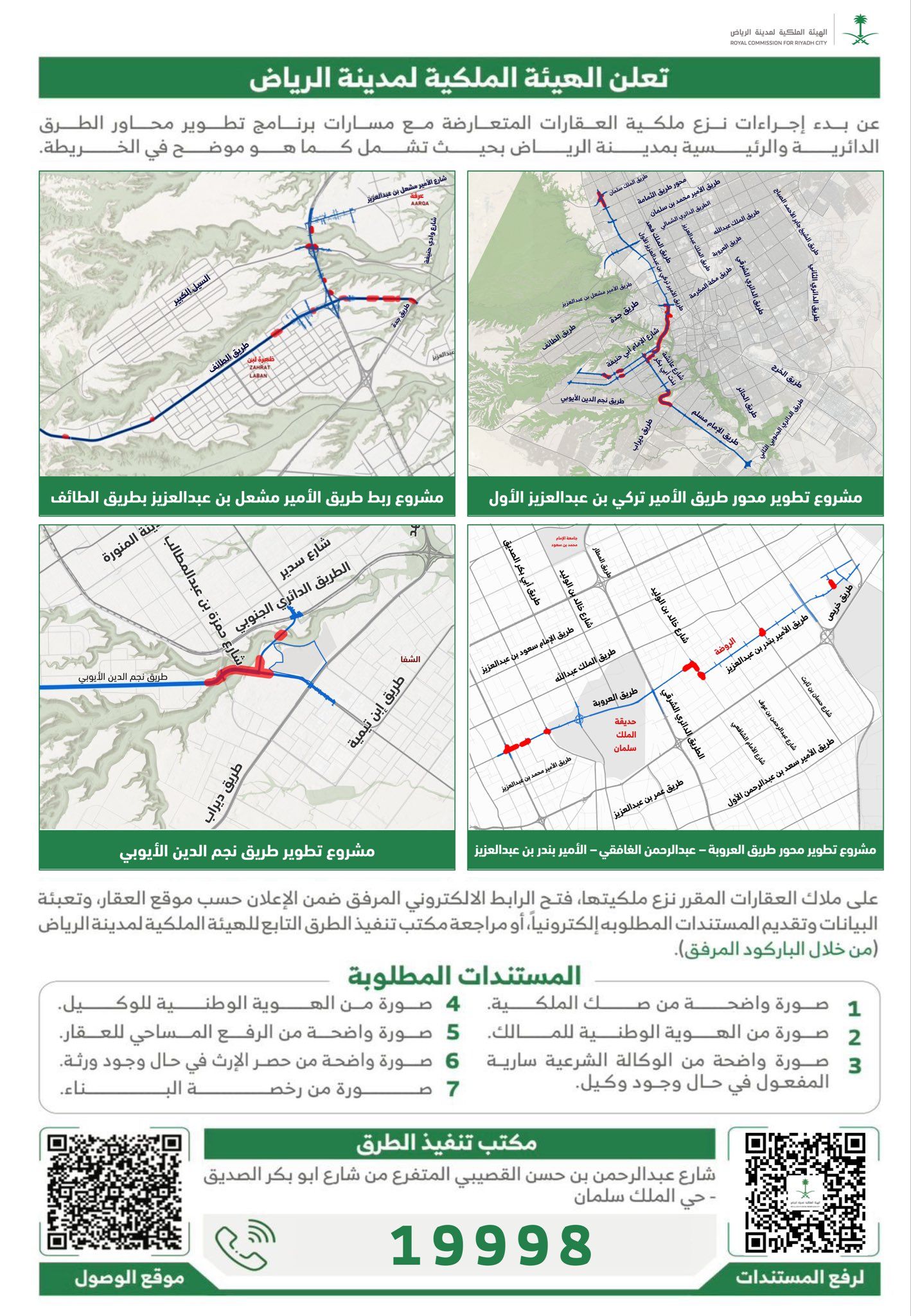 أعلنت الهيئة الملكية لمدينة الرياض عن بدء إجراءات نزع ملكية عدد من العقارات الواقعة ضمن مسارات #برنامج_تطوير_محاور_الطرق الدائرية والرئيسية في مدينة الرياض، وذلك في إطار جهودها لتطوير البنية التحتية وتعزيز كفاءة شبكة الطرق في العاصمة.