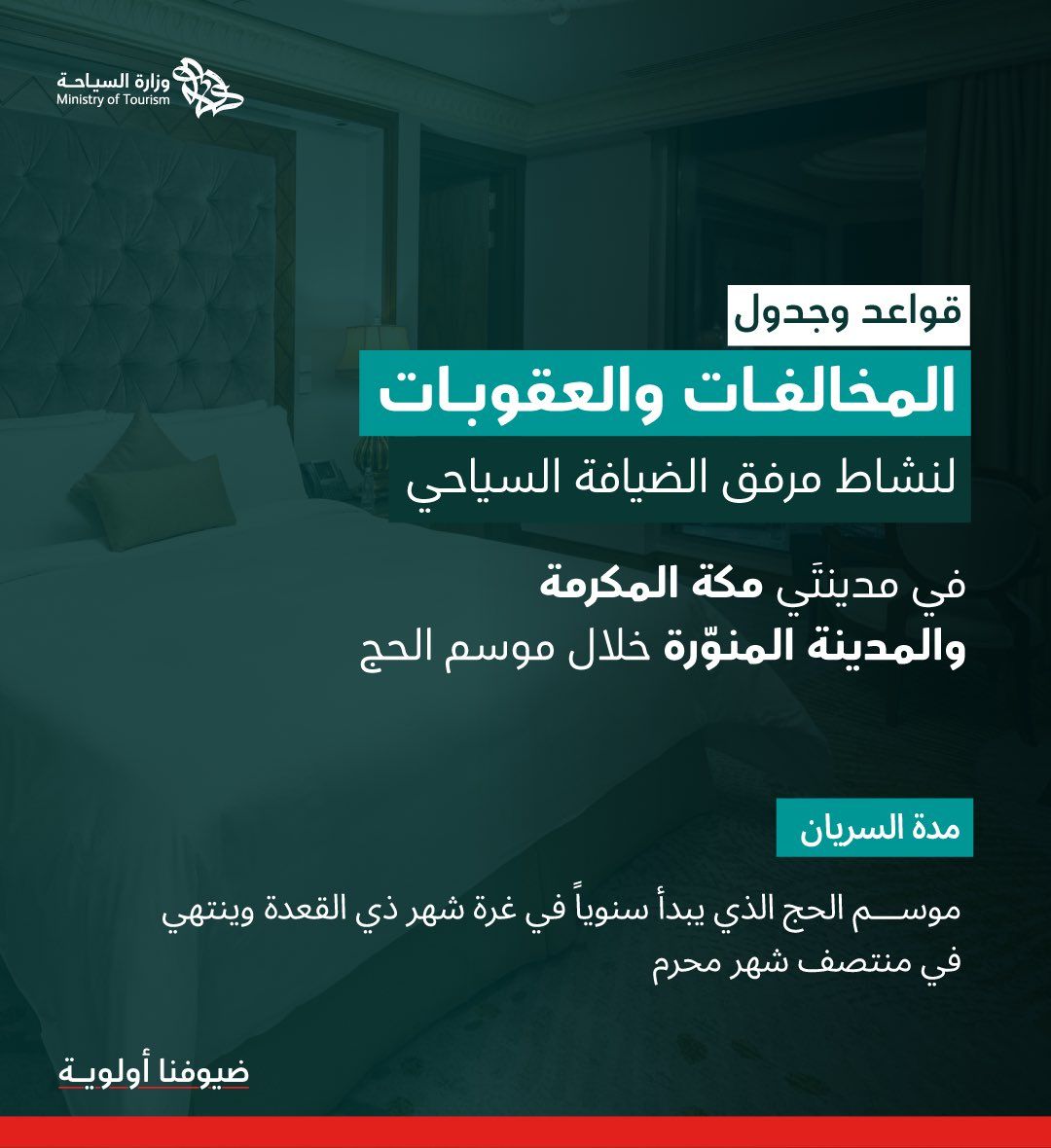 ودعت الوزارة المنشآت والعاملين في قطاع الضيافة إلى الاطلاع على تفاصيل القواعد وجدول المخالفات والعقوبات عبر الموقع الرسمي، والالتزام بالأنظمة والتعليمات لضمان تقديم أفضل الخدمات خلال الموسم.