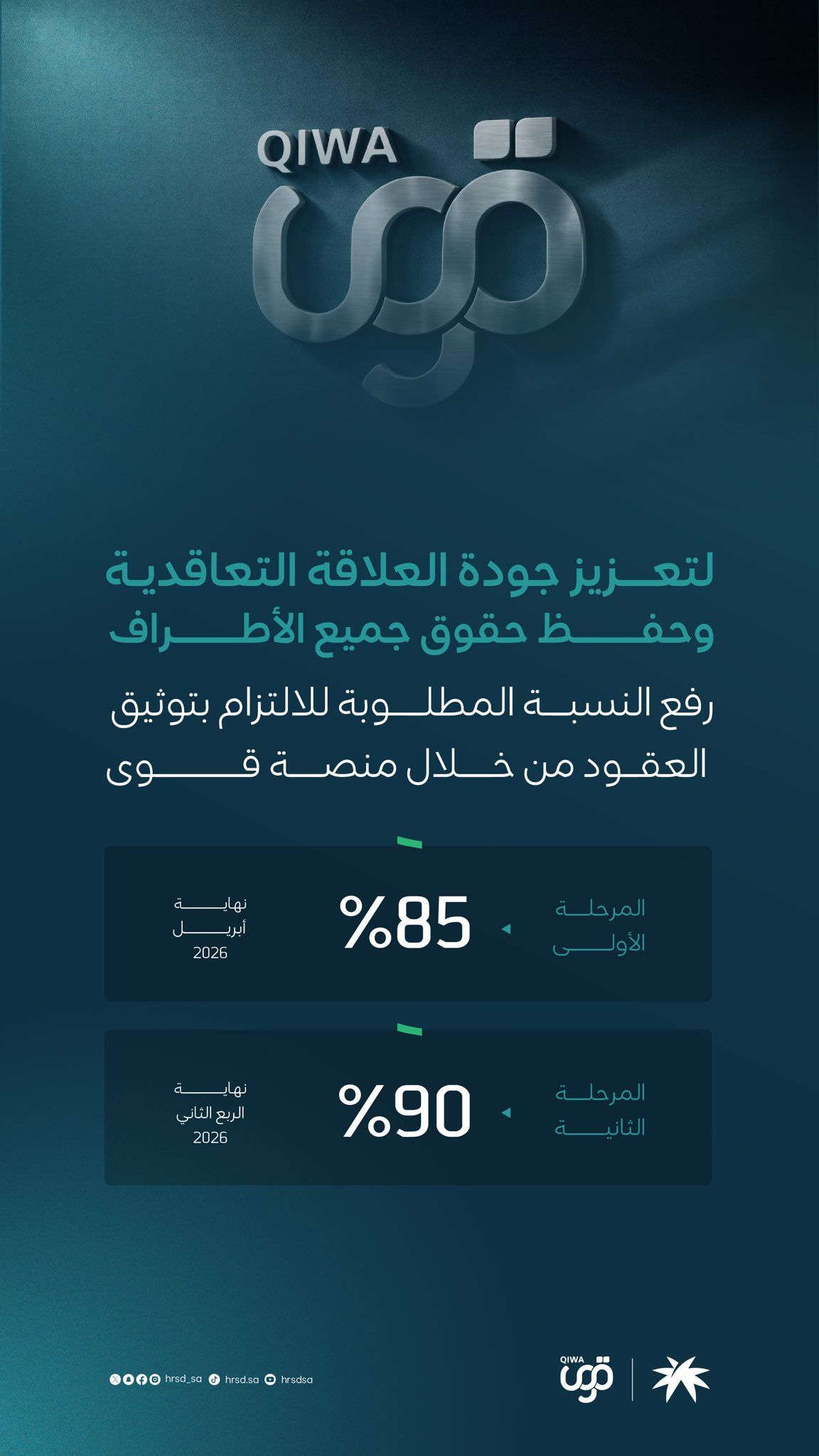 أعلنت وزارة الموارد البشرية والتنمية الاجتماعية تحديث ضوابط الالتزام بتوثيق عقود العمل عبر منصة “قوى”، من خلال رفع نسبة الالتزام المستهدفة إلى 85% اعتبارًا من 30 أبريل 2026، على أن تُستكمل المرحلة الثانية برفع النسبة إلى 90% بنهاية 30 يونيو 2026.