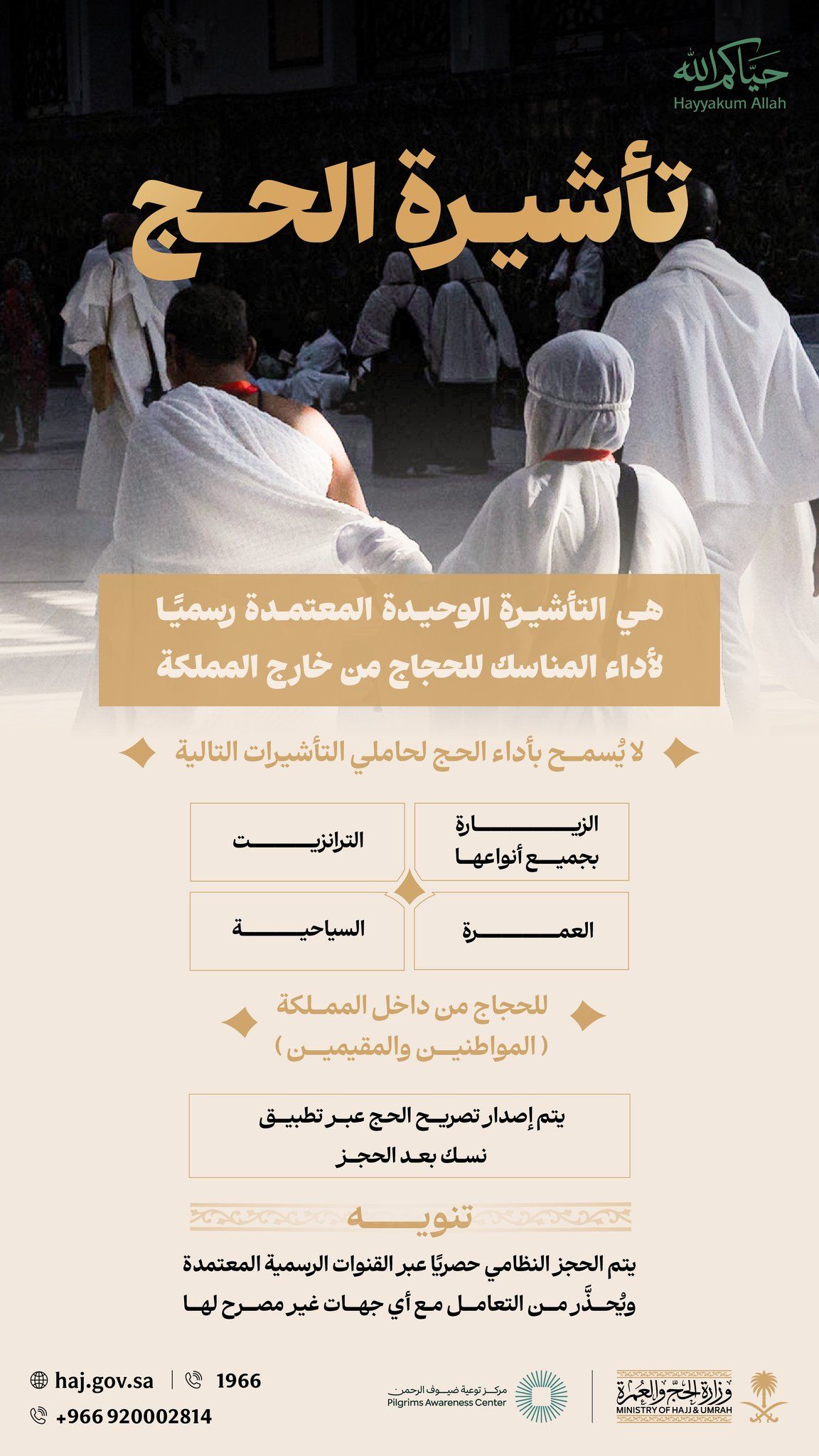 وأوضحت الوزارة، عبر إنفوجرافيك توعوي صادر عن مركز توعية ضيوف الرحمن، أن تأشيرة الحج هي التأشيرة الوحيدة المعتمدة رسميًا لأداء مناسك الحج للحجاج القادمين من خارج المملكة، مؤكدةً عدم السماح بأداء الحج لحاملي التأشيرات الأخرى، والتي تشمل: تأشيرات الزيارة بمختلف أنواعها، وتأشيرات الترانزيت، وتأشيرات العمرة، بالإضافة إلى التأشيرات السياحية.