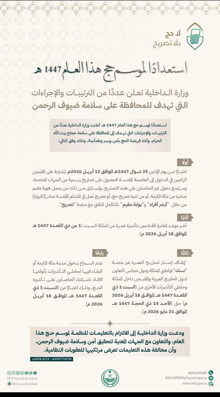 وبيّنت الوزارة كذلك أنه لن يُسمح بدخول أو البقاء في مكة المكرمة لحاملي جميع أنواع التأشيرات، باستثناء تأشيرة الحج، اعتبارًا من 1 ذو القعدة 1447هـ الموافق 18 أبريل 2026م.