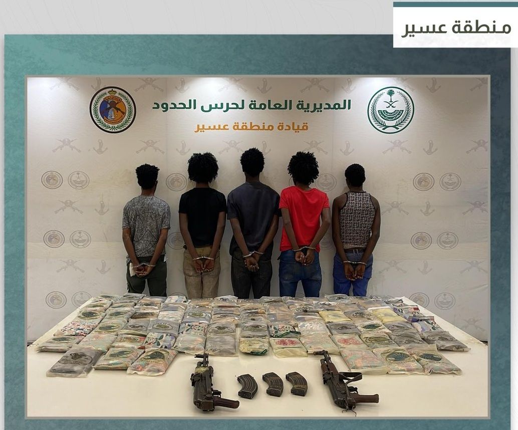 تمكنت الدوريات البرية لحرس الحدود في قطاع الربوعة بمنطقة عسير من القبض على (5) مخالفين لنظام أمن الحدود من الجنسية الإثيوبية، بعد تورطهم في تهريب (80) كيلوجرامًا من مادة الحشيش المخدر، حيث جرى استكمال الإجراءات النظامية الأولية بحقهم، وتسليمهم مع المضبوطات إلى جهة الاختصاص.