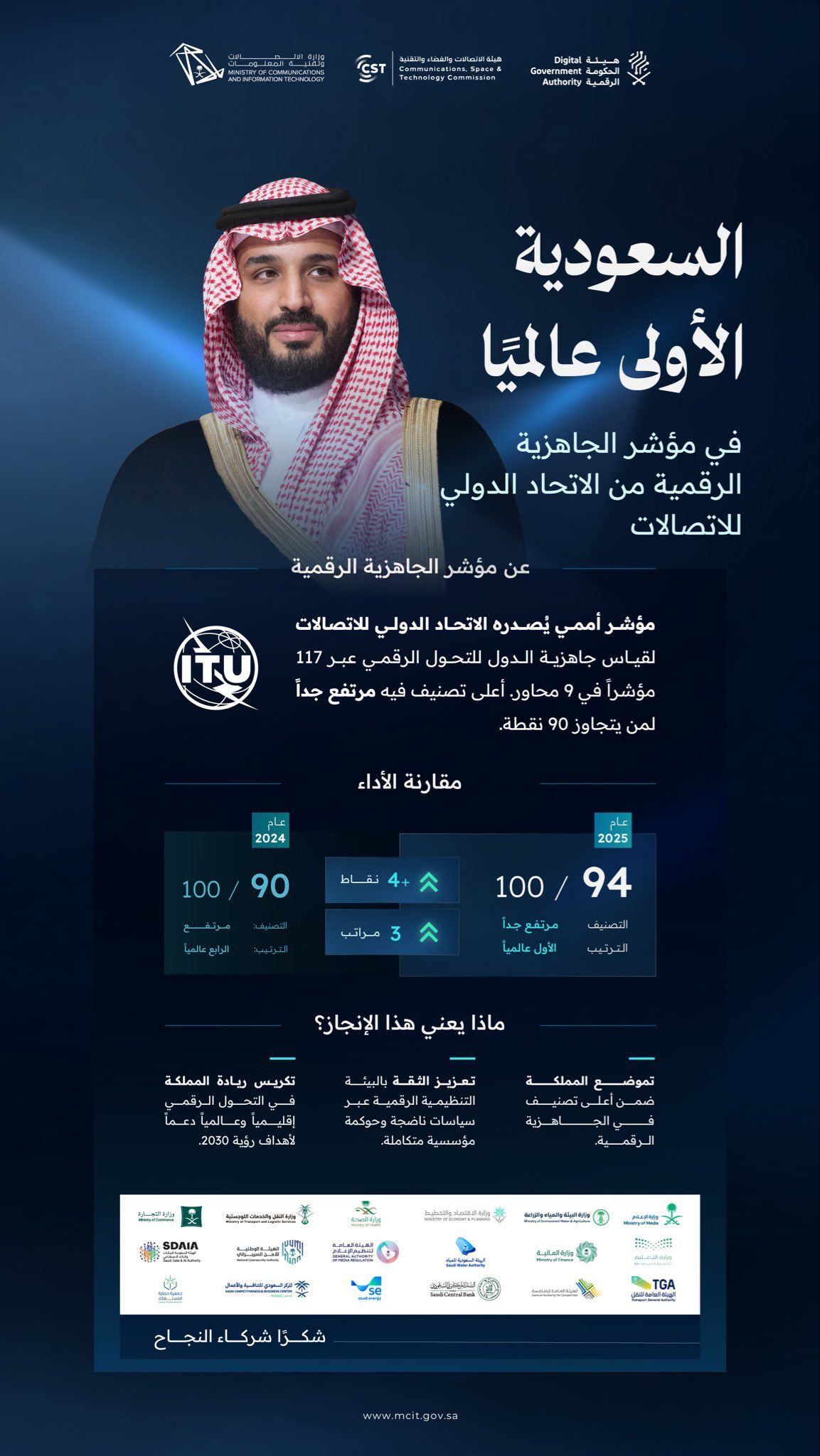 ويأتي هذا الإنجاز نتيجة تكامل الجهود الوطنية بين عدد من الجهات الحكومية والتنظيمية، من بينها وزارة المالية، ووزارة التجارة، ووزارة الإعلام، ووزارة الصحة، ووزارة التعليم، ووزارة الاقتصاد والتخطيط، ووزارة البيئة والمياه والزراعة، إضافة إلى هيئة الاتصالات والفضاء والتقنية، وهيئة الحكومة الرقمية، والبنك المركزي السعودي، والهيئة السعودية للبيانات والذكاء الاصطناعي، والهيئة الوطنية للأمن السيبراني، إلى جانب عدد من الجهات الشريكة مثل الهيئة العامة لتنظيم الإعلام، والهيئة العامة للنقل، والهيئة السعودية للمياه، والهيئة السعودية لتنظيم الكهرباء، والهيئة العامة للمنافسة، والمركز الوطني للتنافسية، وجمعية حماية المستهلك.