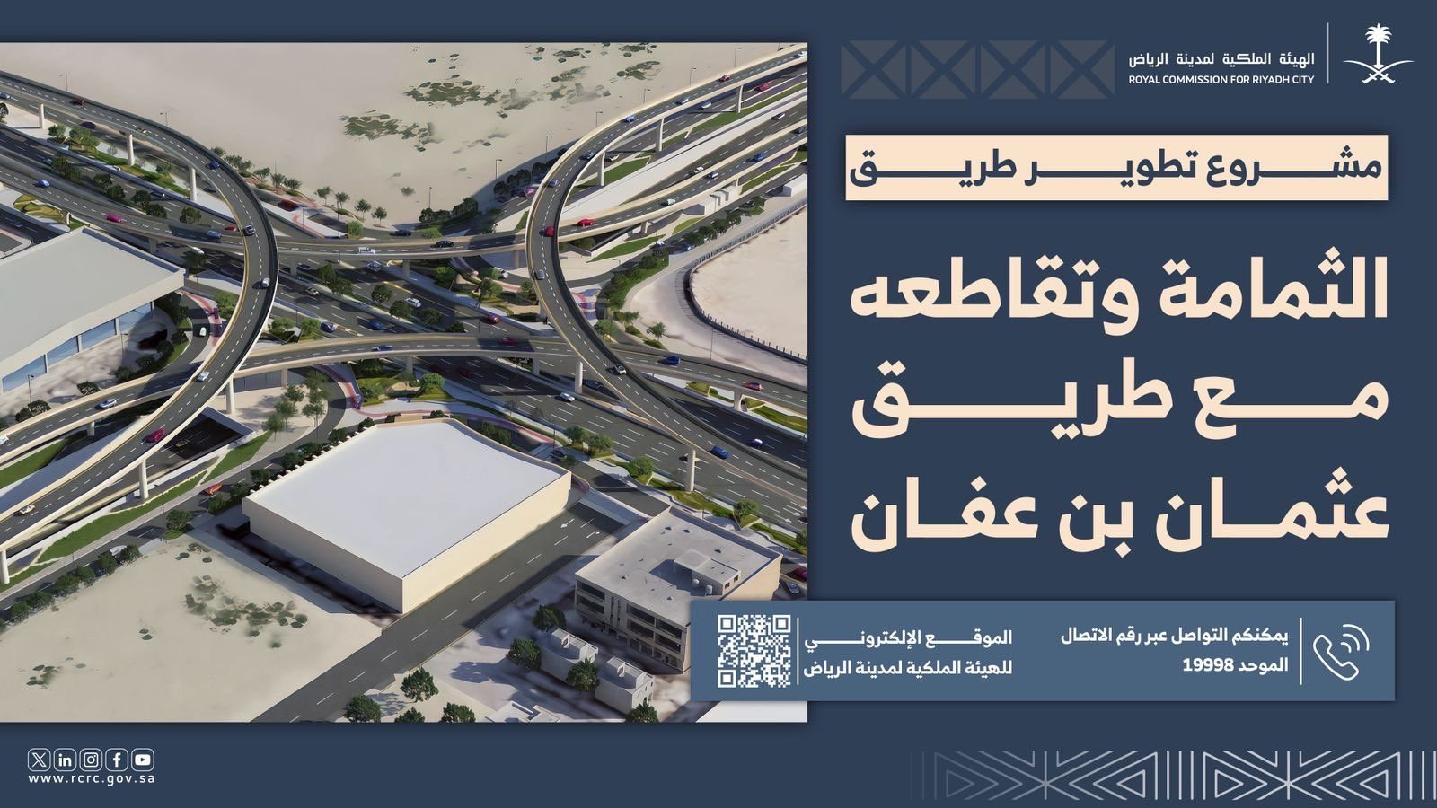 أعلنت الهيئة الملكية لمدينة الرياض عن بدء تنفيذ مشروع تطوير تقاطع طريق الثمامة مع طريق عثمان بن عفان في الرياض، ابتداءً من يوم الخميس 16 أبريل 2026، وذلك ضمن برنامج تطوير محاور الطرق.