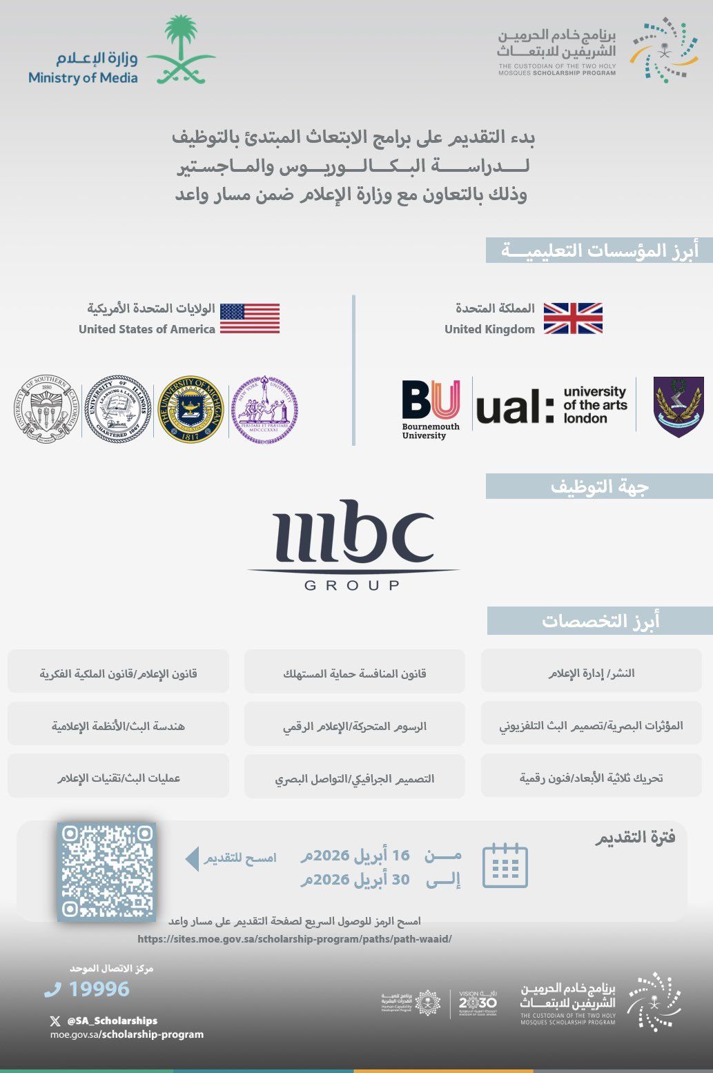 أُعلن عن فتح باب التقديم على برامج الابتعاث المبتدئ بالتوظيف المقدمة من مجموعة MBC، وذلك ضمن مسار “واعد” أحد مسارات برنامج خادم الحرمين الشريفين للابتعاث الخارجي، بالتعاون مع وزارة الإعلام، في خطوة تهدف إلى تأهيل الكوادر الوطنية في المجالات الإعلامية المتقدمة.