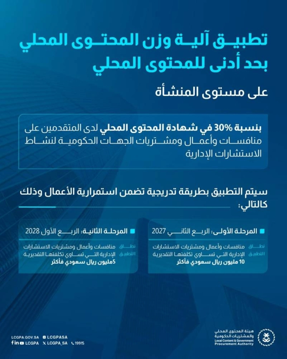 وأوضحت الهيئة أنه سيتم اشتراط حد أدنى للمحتوى المحلي على مستوى المنشأة بنسبة (30%) على منافسات الاستشارات الإداريةعلى مرحلتين؛ تبدأ اعتباراُ من 1 أبريل 2027 على المنافسات التي تبلغ تكلفتها التقديرية (10 مليون ريال سعودي) فأكثر، على أن يشمل لاحقًا المنافسات التي تبلغ (5 مليون ريال سعودي) فأكثر ابتداءً من 1 يناير 2028.