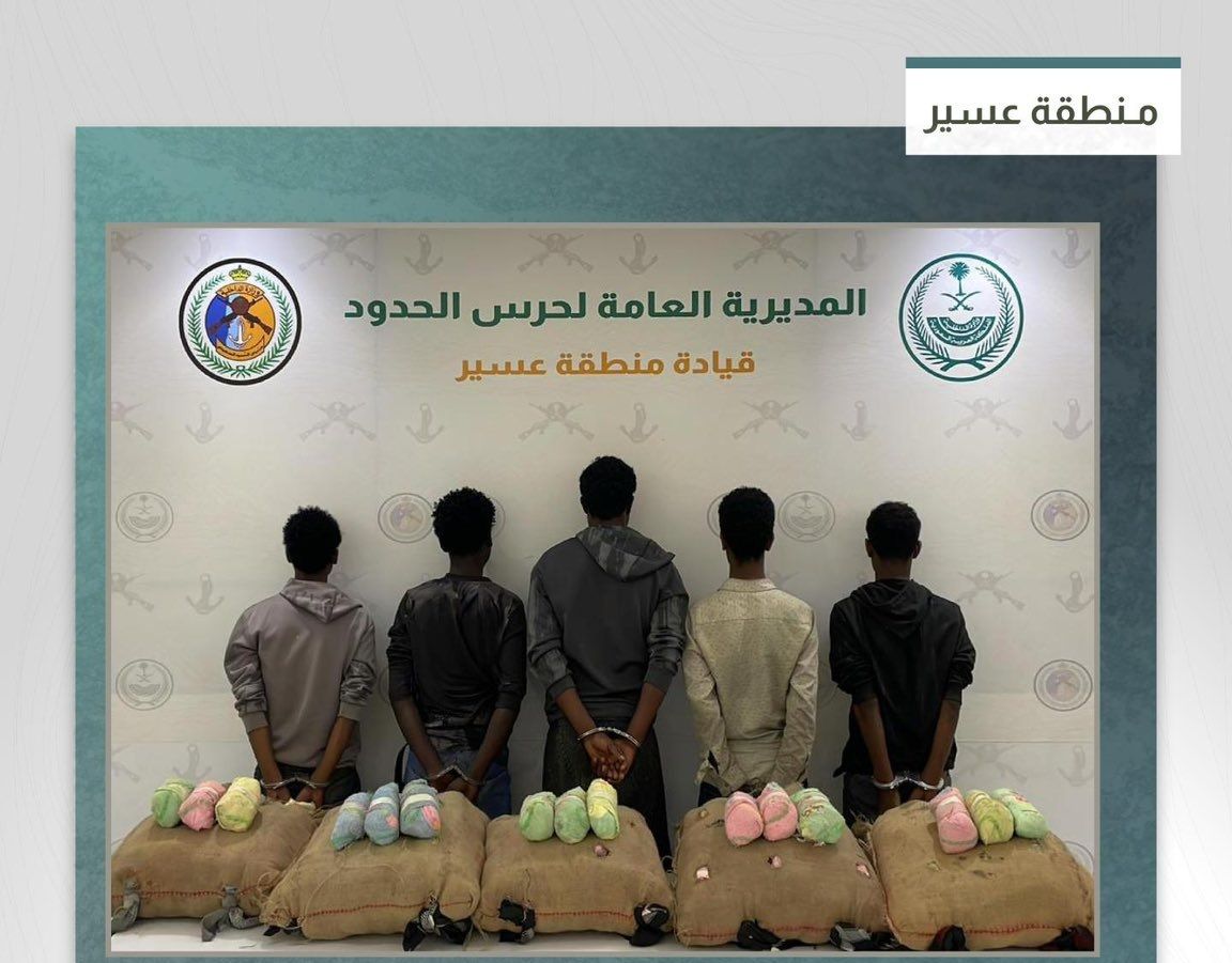 قبضت الدوريات البرية لحرس الحدود في قطاع الربوعة بمنطقة عسير على (5) مخالفين لنظام أمن الحدود من الجنسية الإثيوبية، بعد تورطهم في تهريب (100) كيلوجرام من نبات القات المخدر.