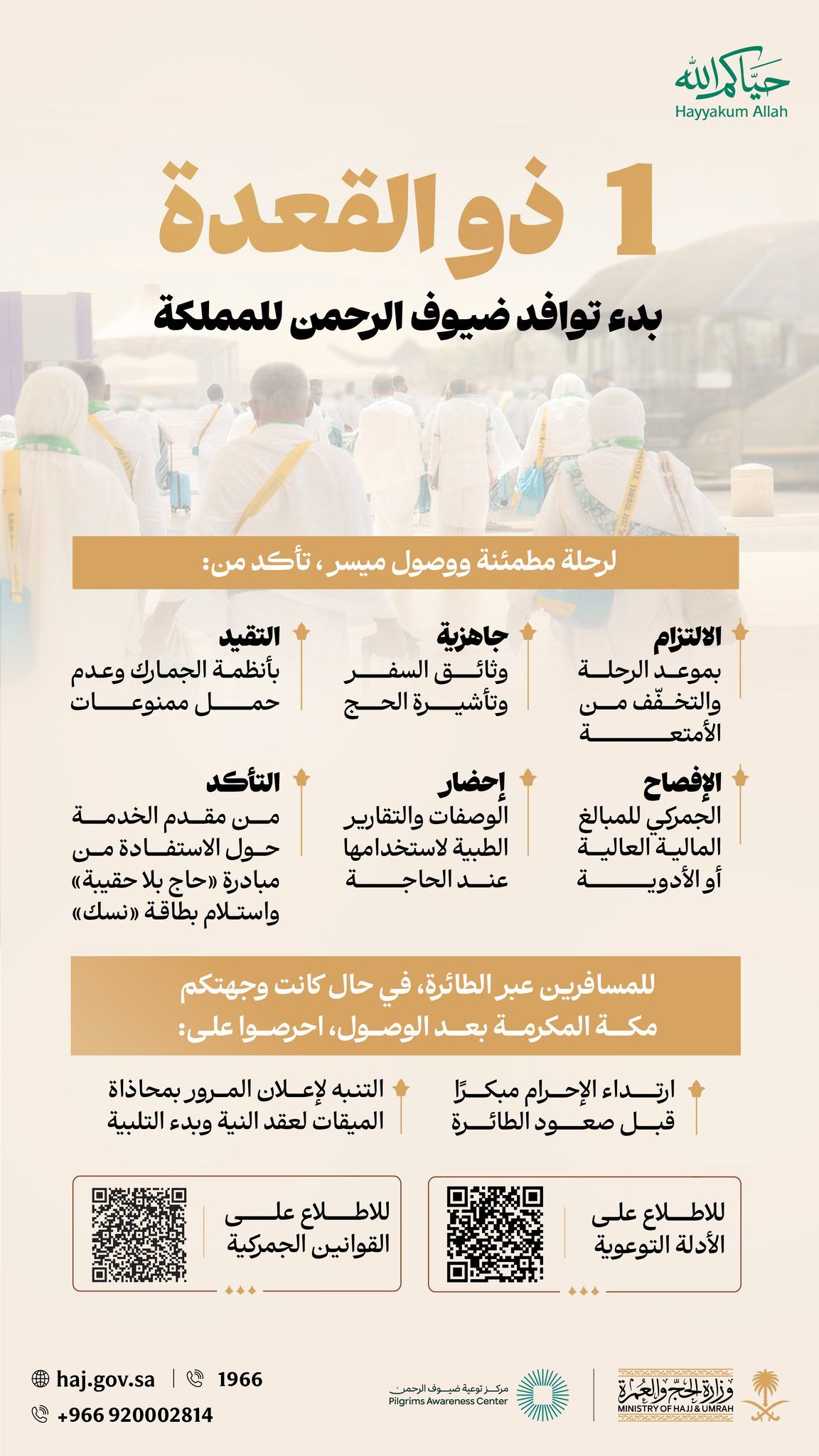 وأكدت وزارة الحج والعمرة أهمية التزام الحجاج بالتعليمات والإرشادات الصادرة لضمان رحلة آمنة وميسّرة، مشددة على ضرورة التقيد بمواعيد الرحلات الجوية، والتخفف من الأمتعة، إلى جانب التأكد من جاهزية وثائق السفر وتأشيرة الحج قبل المغادرة.
