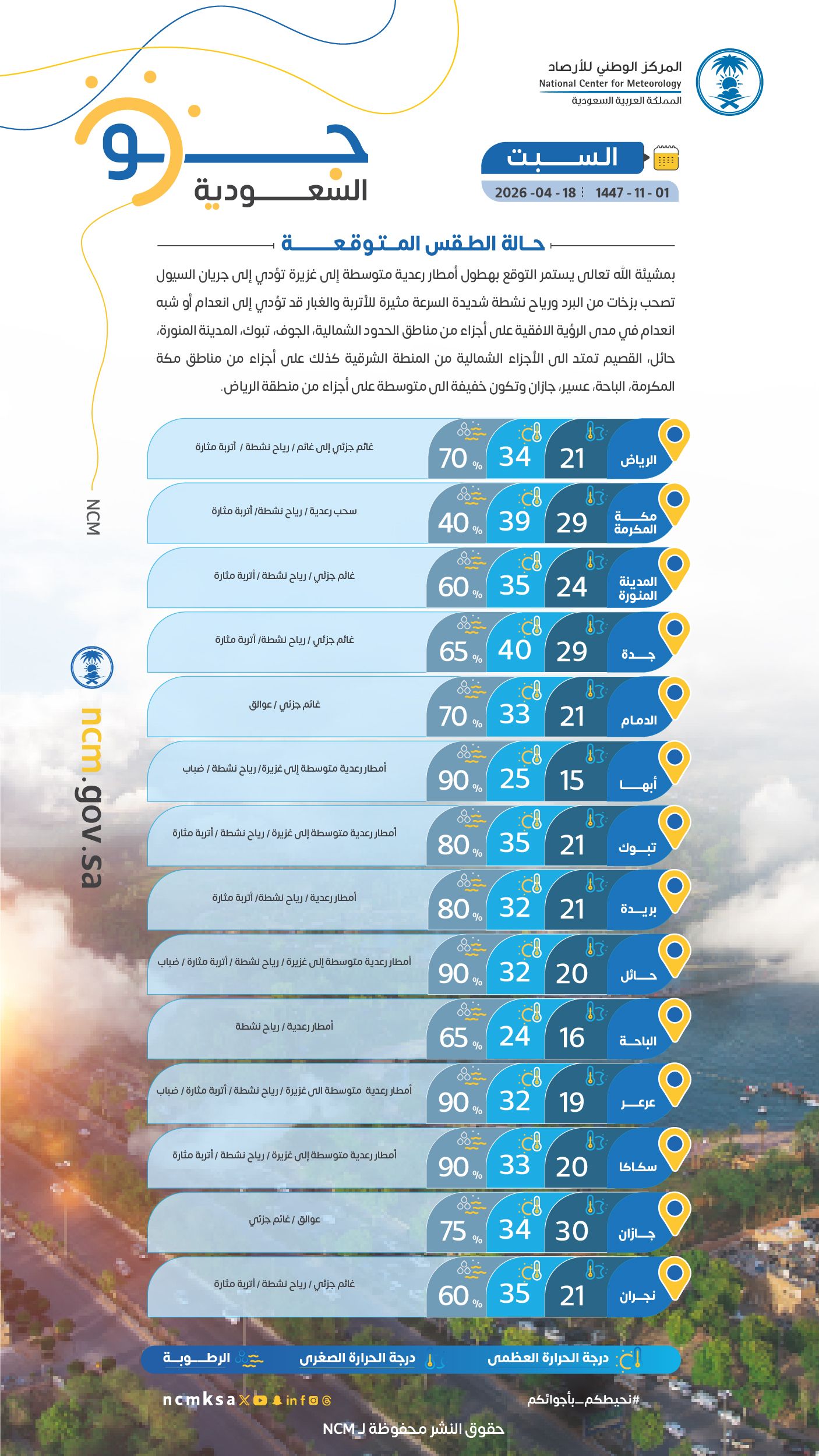 توقّع المركز الوطني للأرصاد في تقريره عن حالة الطقس اليوم، بمشيئة الله، هطول أمطار رعدية متوسطة إلى غزيرة تؤدي إلى جريان السيول، مصحوبة بزخات من البرد ورياح نشطة شديدة السرعة مثيرة للأتربة والغبار، قد تتسبب في انعدام أو شبه انعدام الرؤية الأفقية.