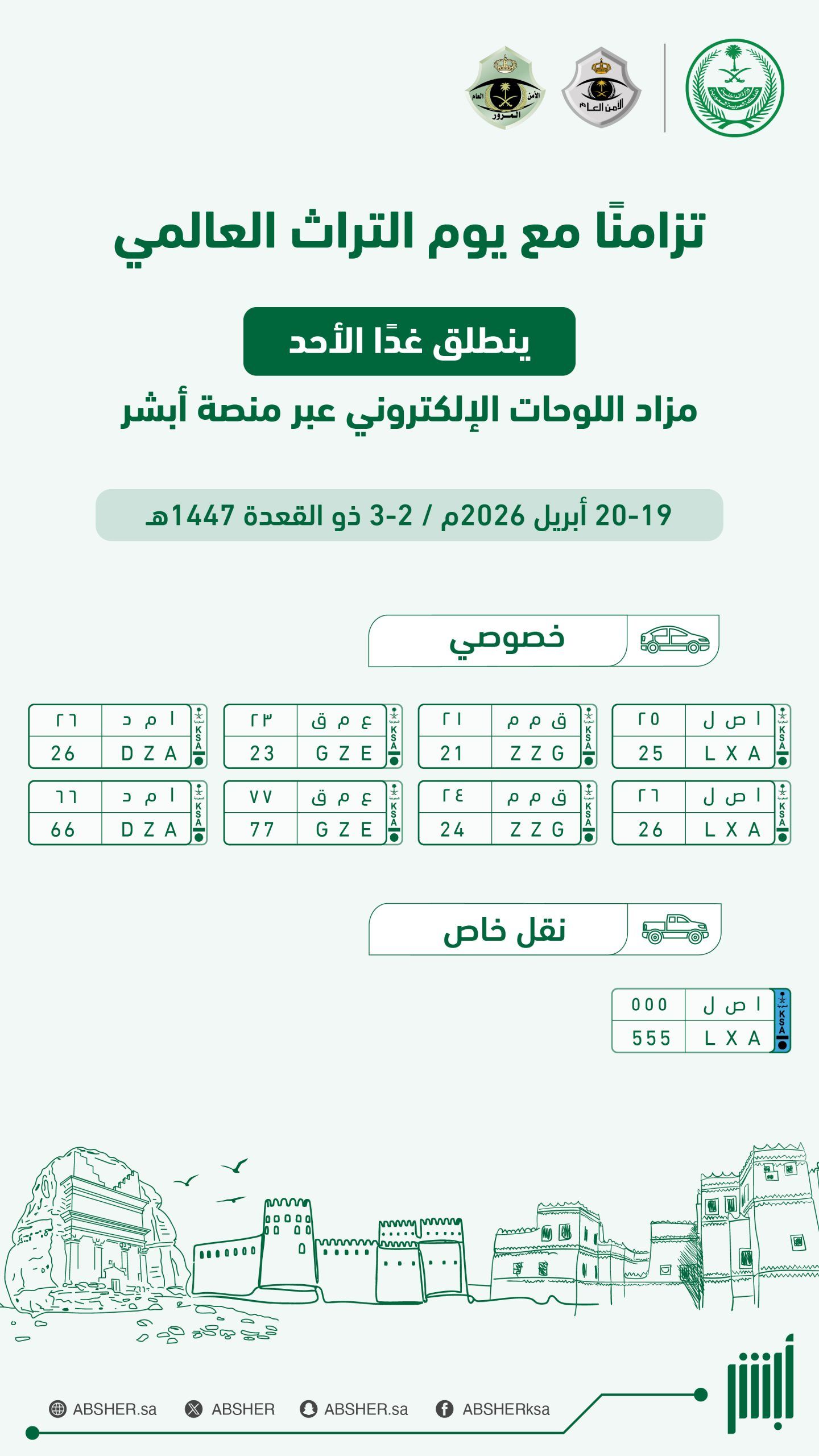 وأوضحت أن المزاد يبدأ يوم الأحد 2 ذو القعدة 1447هـ الموافق 19 أبريل 2026م، ويستمر حتى يوم الإثنين 3 ذو القعدة 1447هـ الموافق 20 أبريل 2026م.
