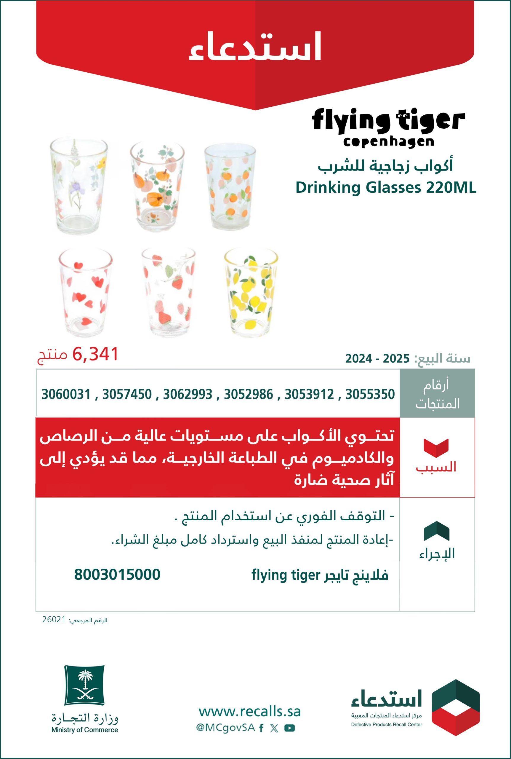 أعلنت وزارة التجارة عن استدعاء 6,341 كوبًا زجاجيًا للشرب سعة 220 مل من منتجات Flying Tiger Copenhagen، والتي تم بيعها خلال الفترة من 2024 إلى 2025.